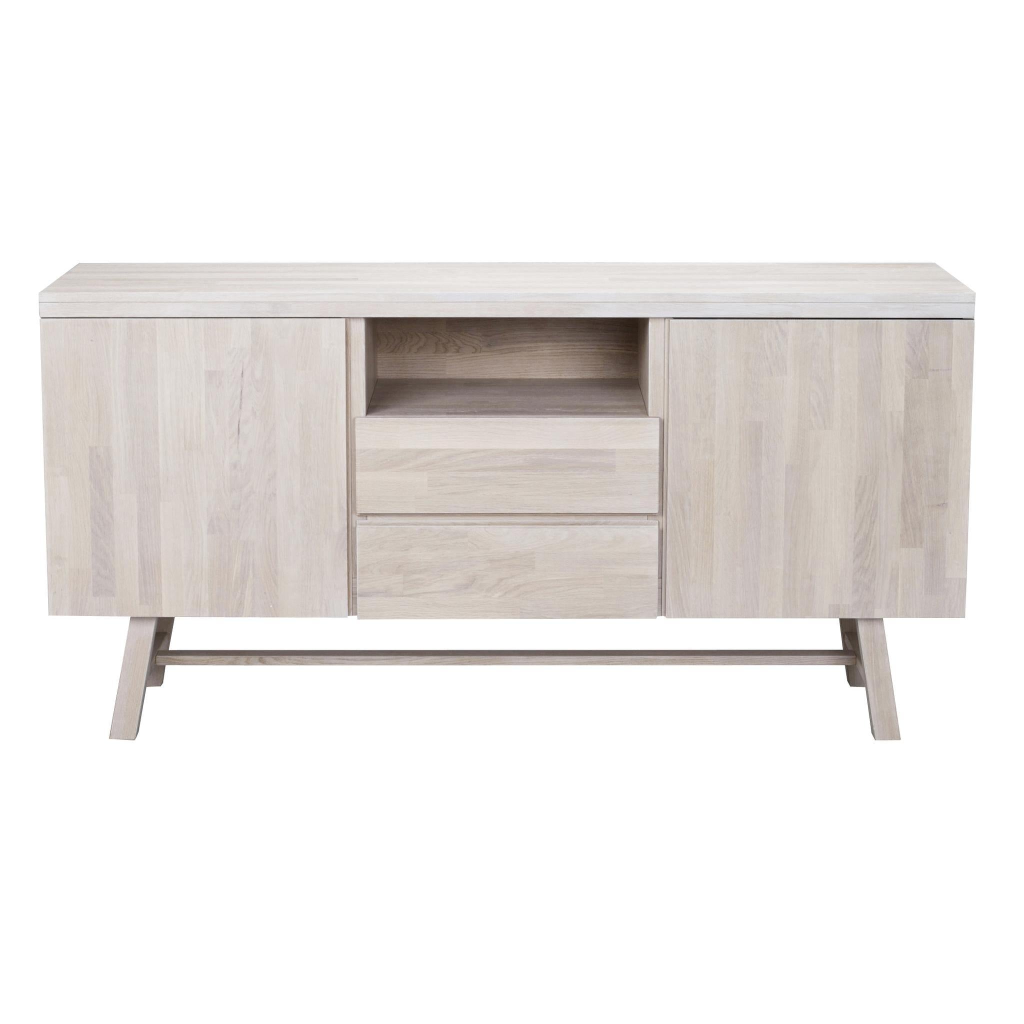 • Sideboard i ljust trä med två skåpsdörrar, två lådor och öppen hylla på sneda ben