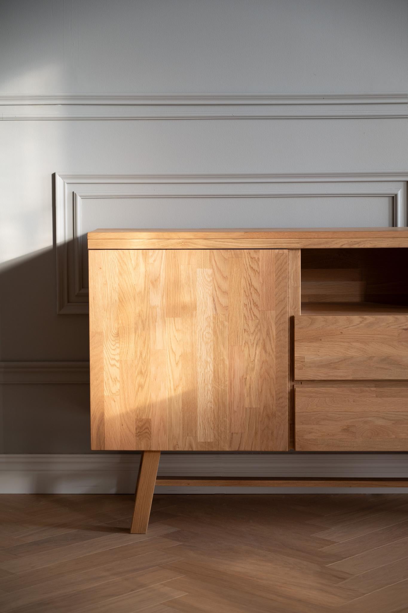• Skänk i ljust trä med två skåp, två lådor och öppen hylla på sneda ben i modern skandinavisk design