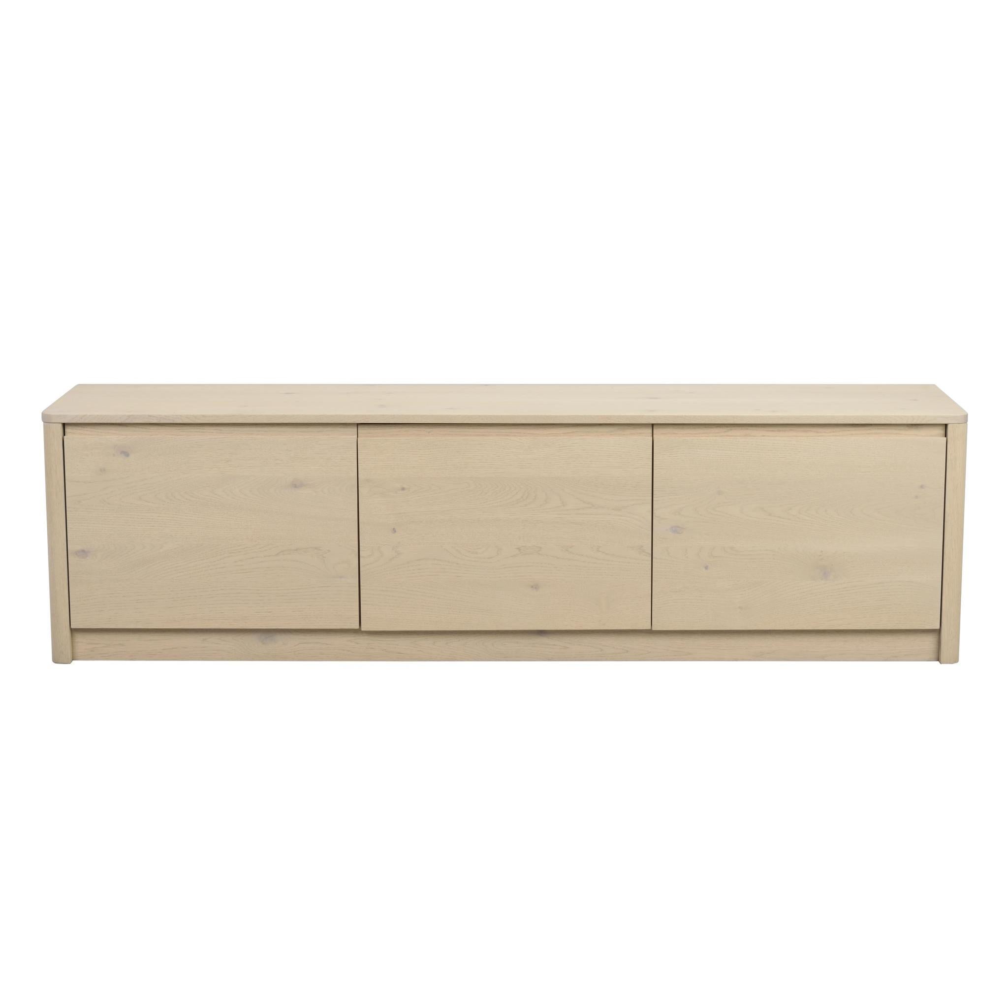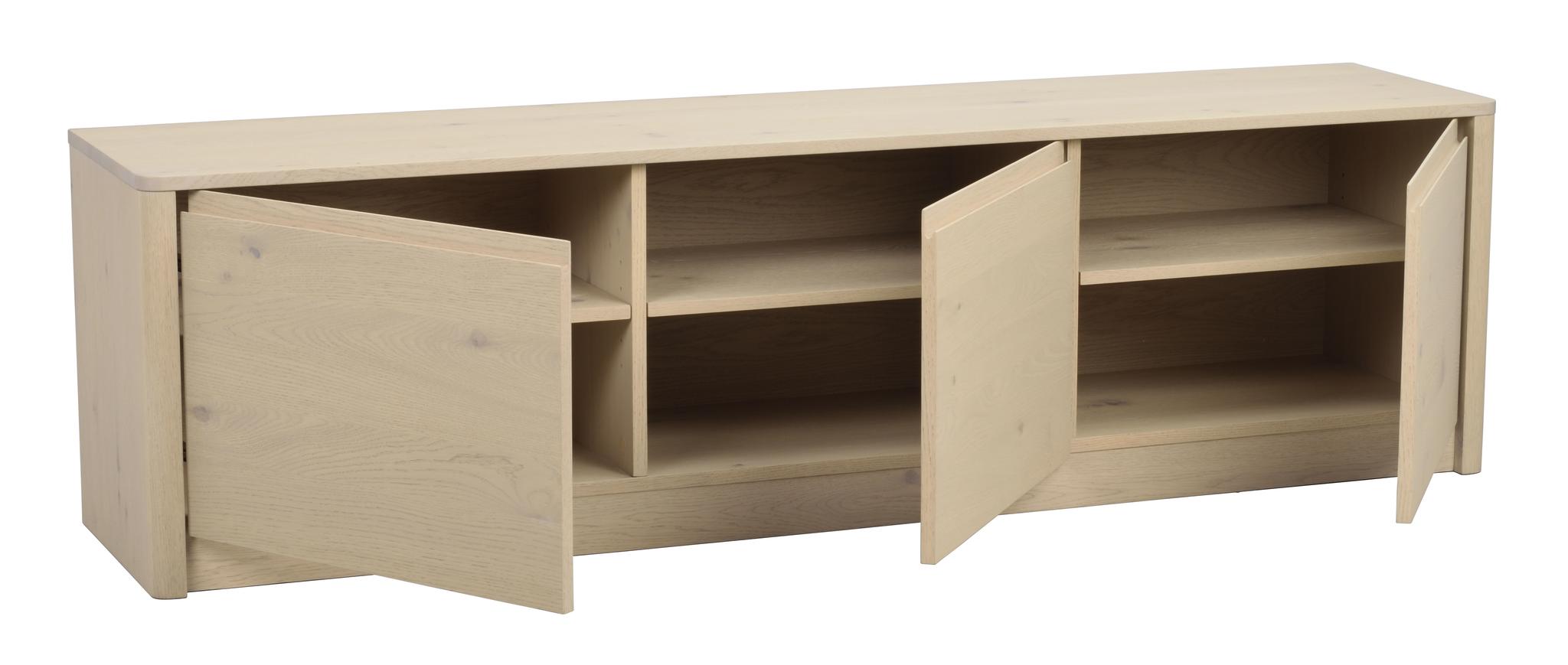 • Ljust TV-bänk i trä med öppna dörrar som visar hyllor och förvaringsutrymmen