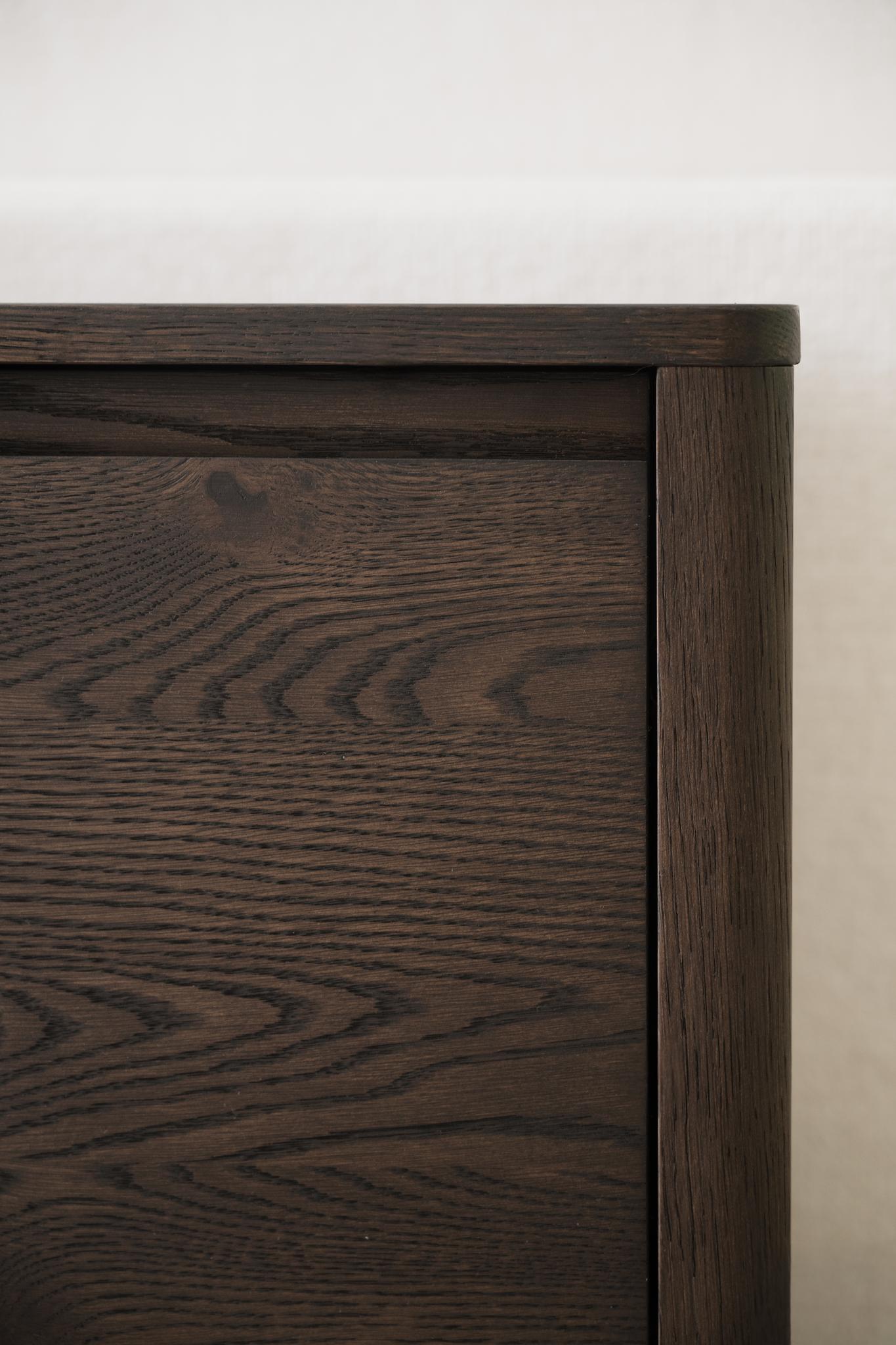 • Närbildsdetalj av mörkbrun byrå i massiv ek med synlig trästruktur och lådor
