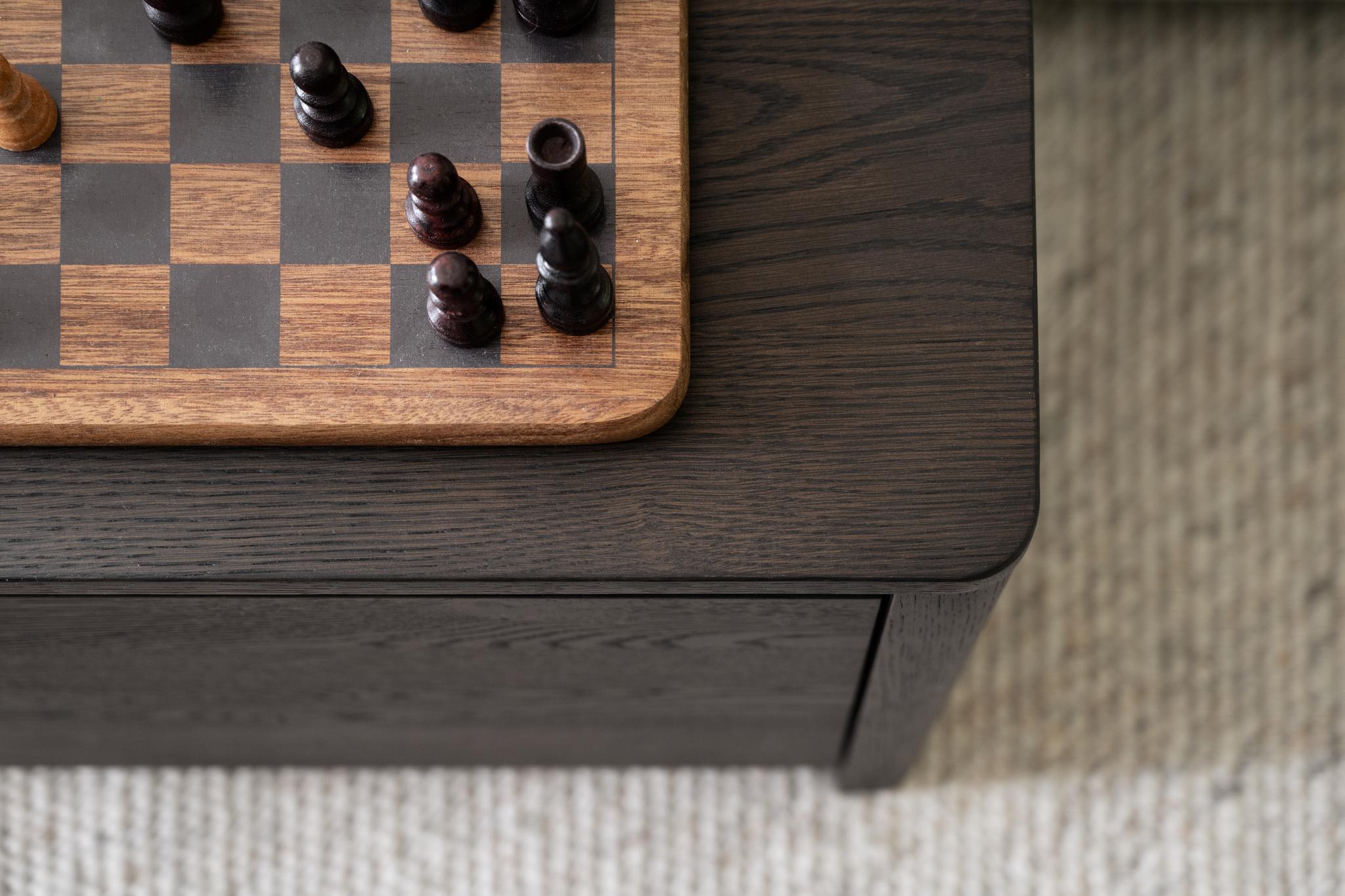 • Mörkgrått soffbord med öppen låda som visar förvaring av keramik, dekorerat med växter och schackbräde