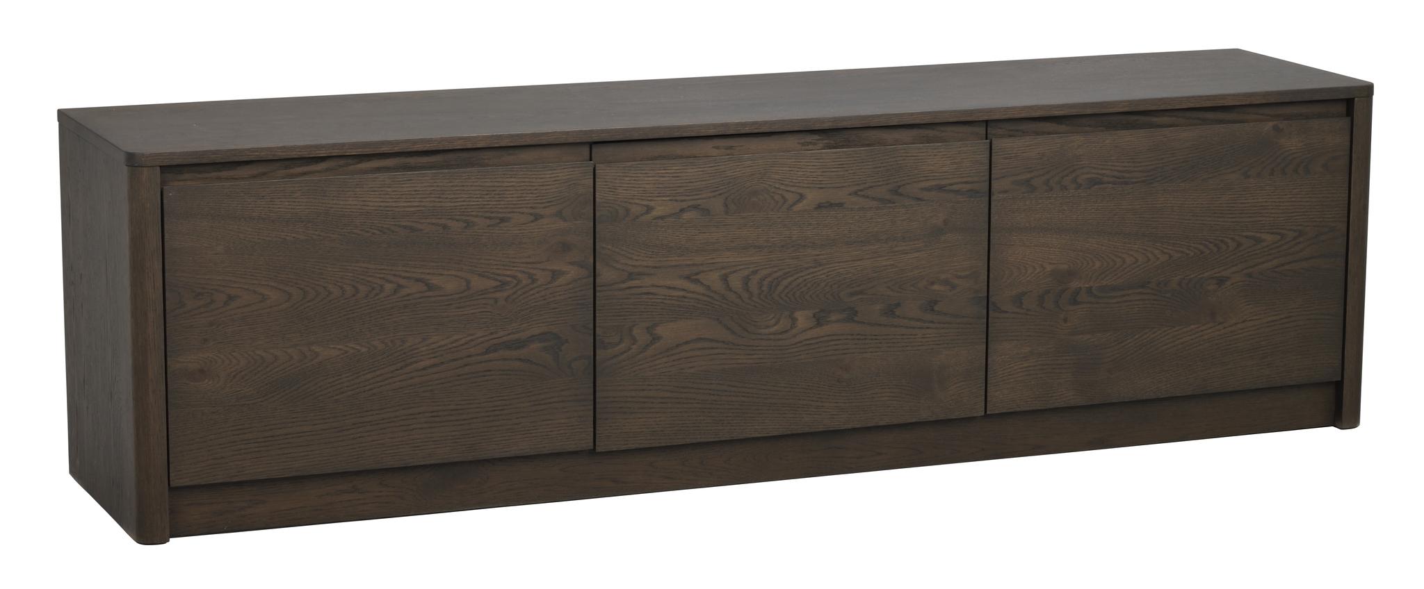 • Mörkbrun tv-bänk i trä med tre skjutdörrar och synlig trästruktur