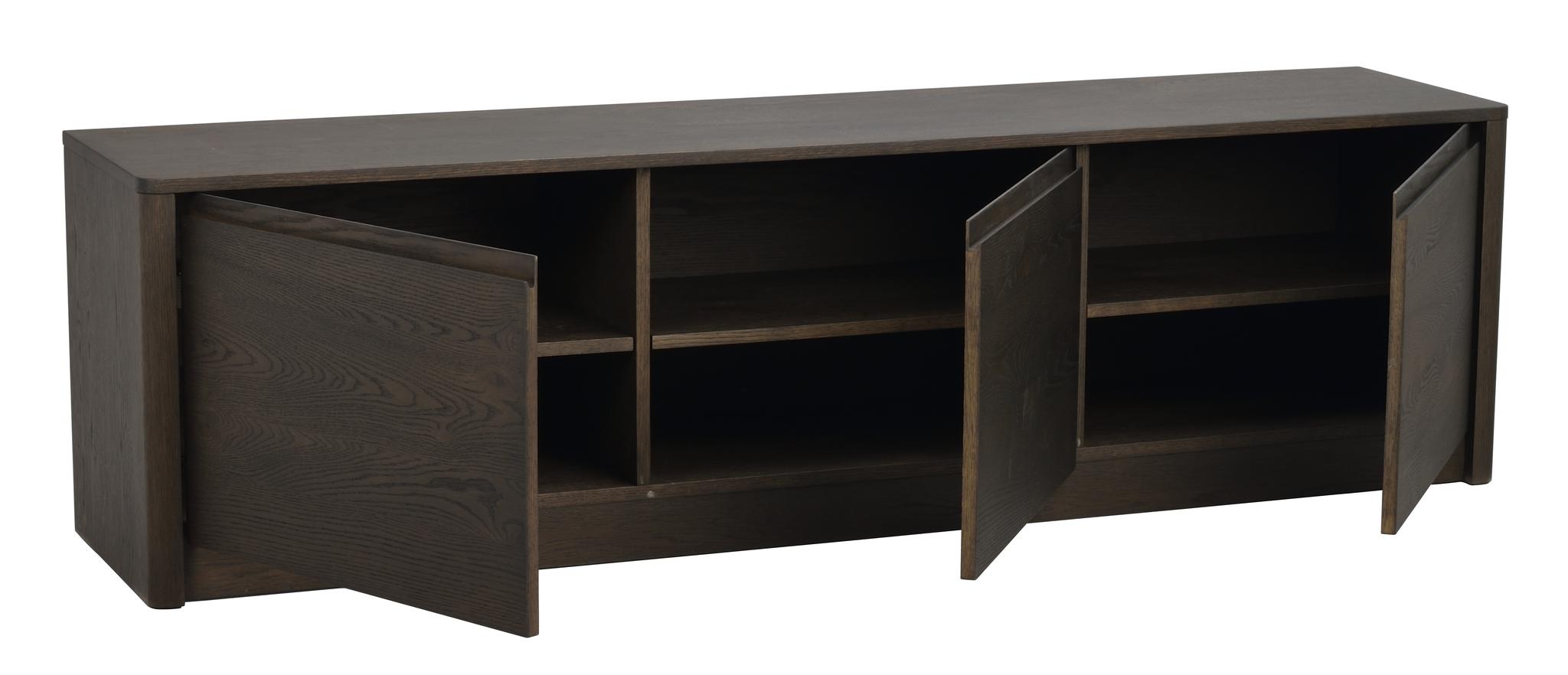 • Mörkt TV-bänk i trä med öppna dörrar som visar förvaring med hyllor och fack