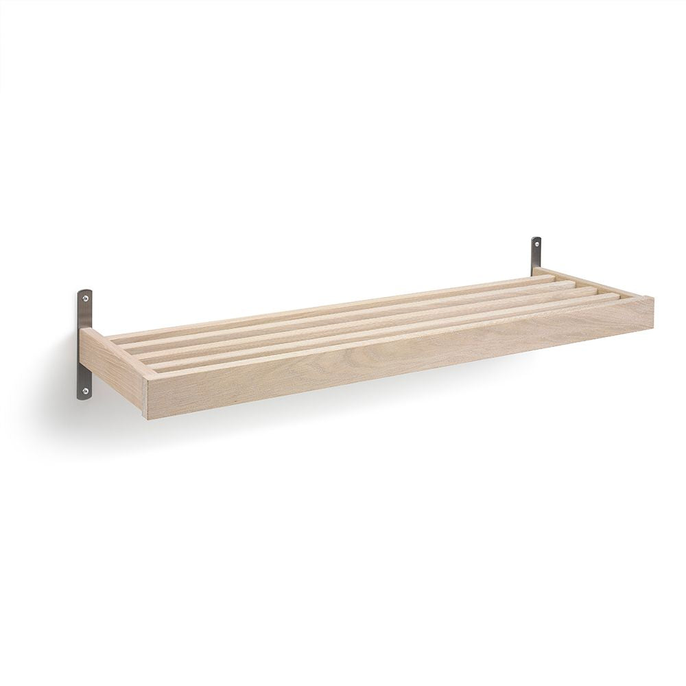 • Väggmonterad trähylla i ek med metallbeslag och räfflad design för förvaring