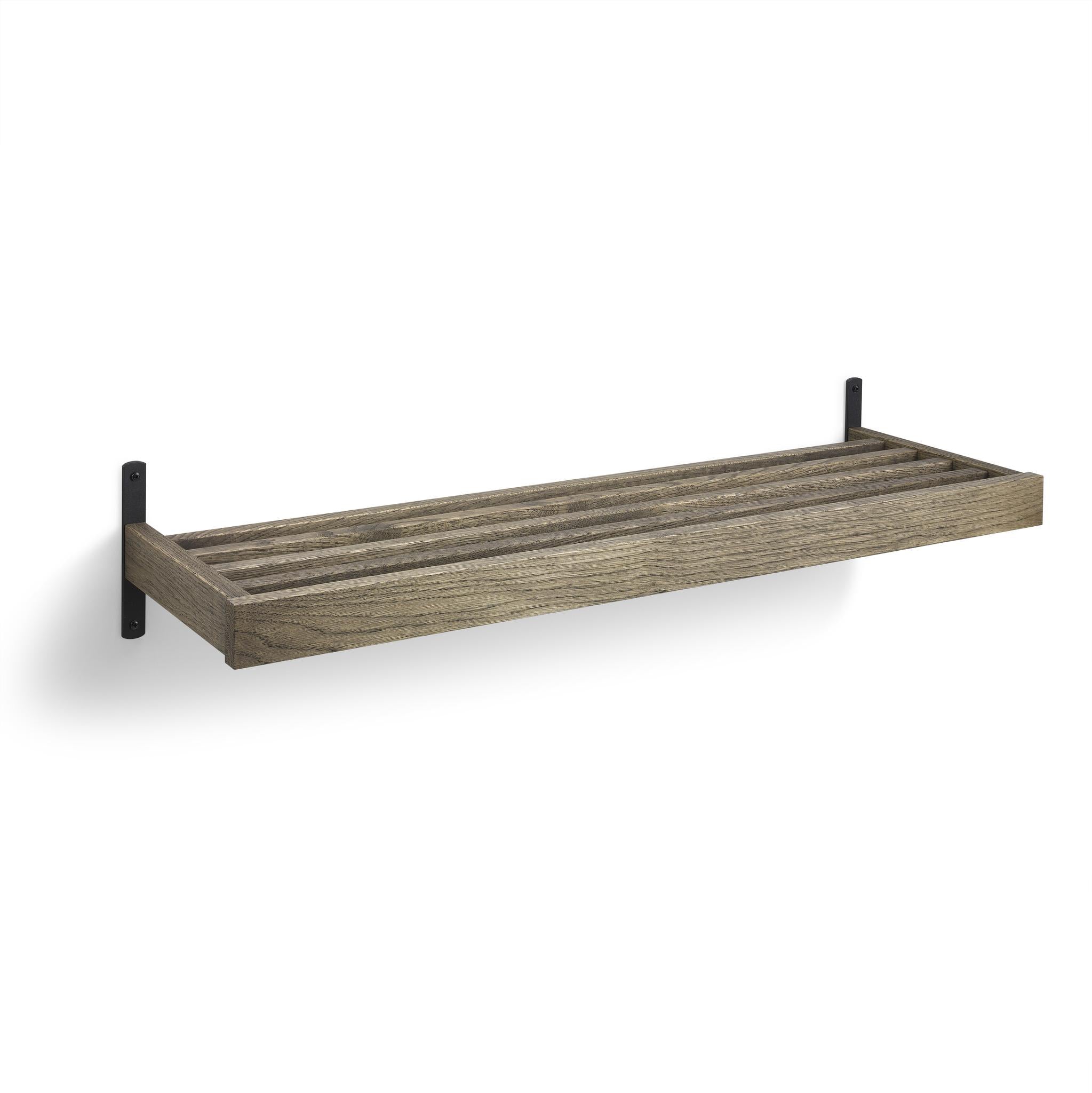 • Väggmonterad trähylla med slatted design i gråbrun ek med mörka metallbeslag