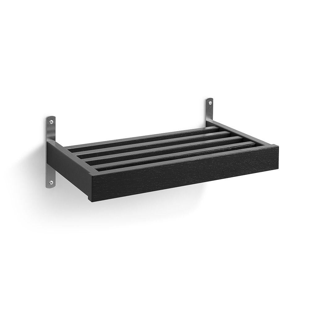 • Väggmonterad trähylla i gråbrun ek med svarta metallkonsoler, slatted design