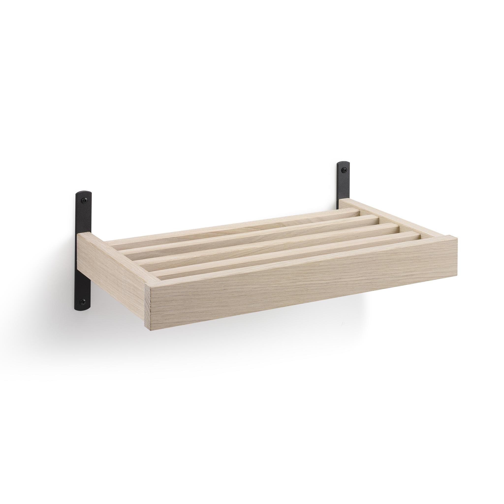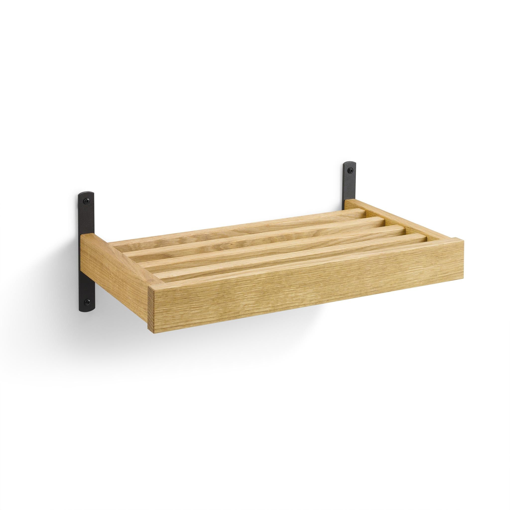 • Väggmonterad hylla i ek med slatted design och svarta metallbeslag