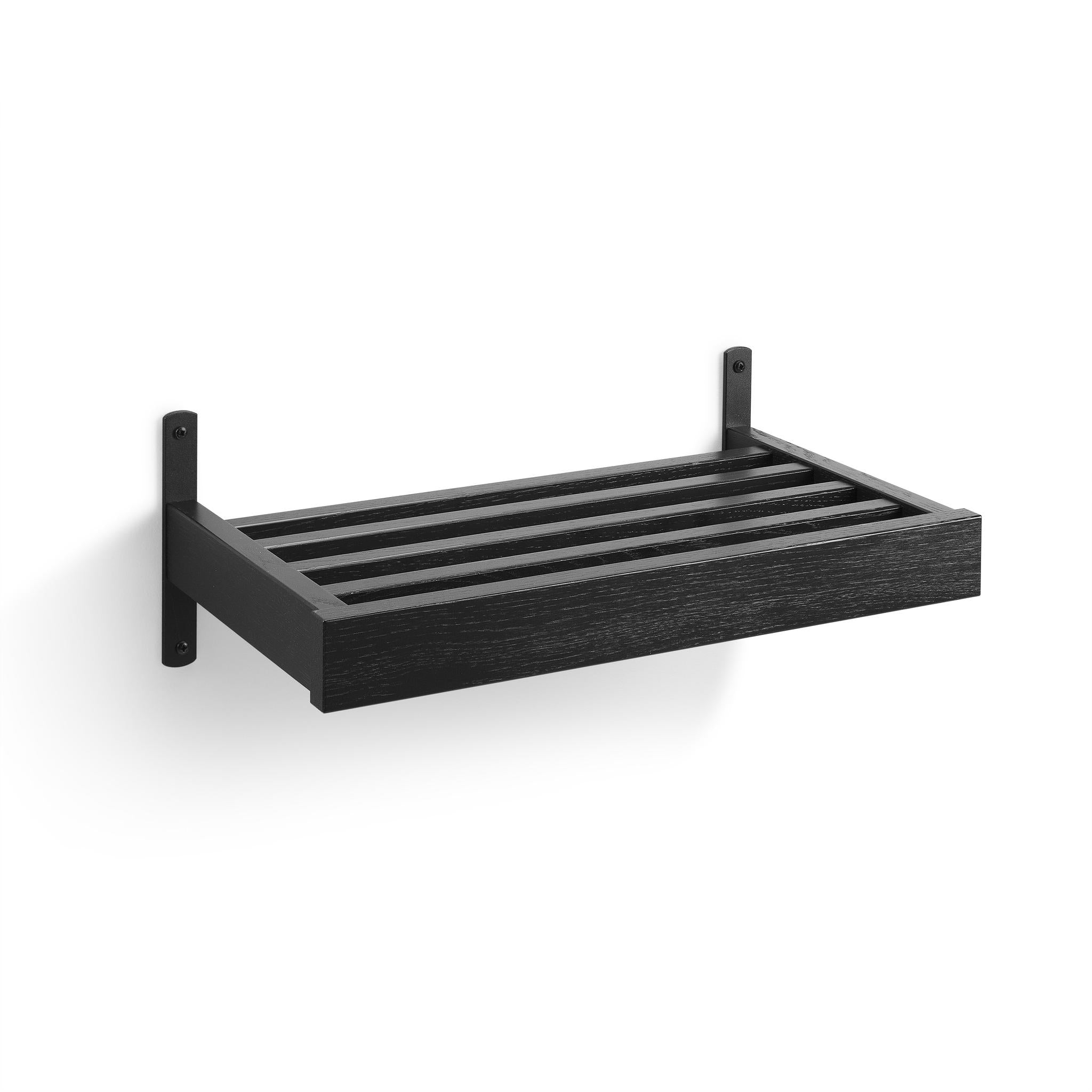 • Svart väggmonterad hylla med räfflad yta och metallbeslag för förvaring