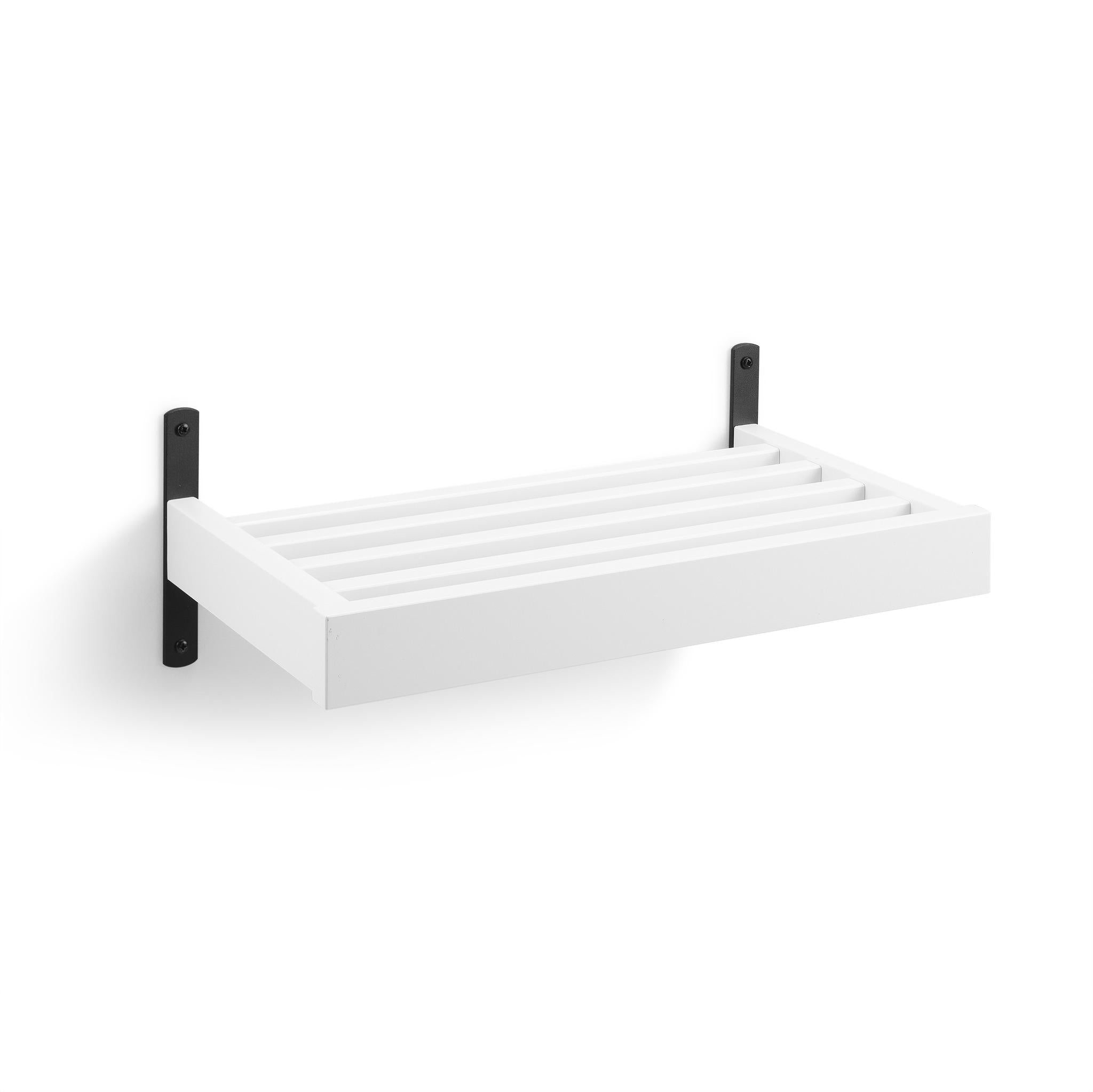 • Vit väggmonterad hylla med svarta fästen och lamelldesign för förvaring