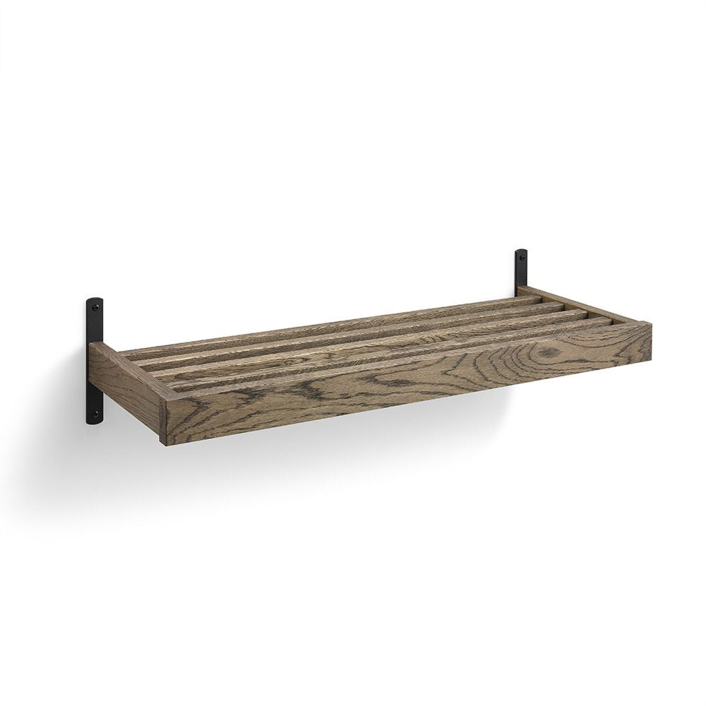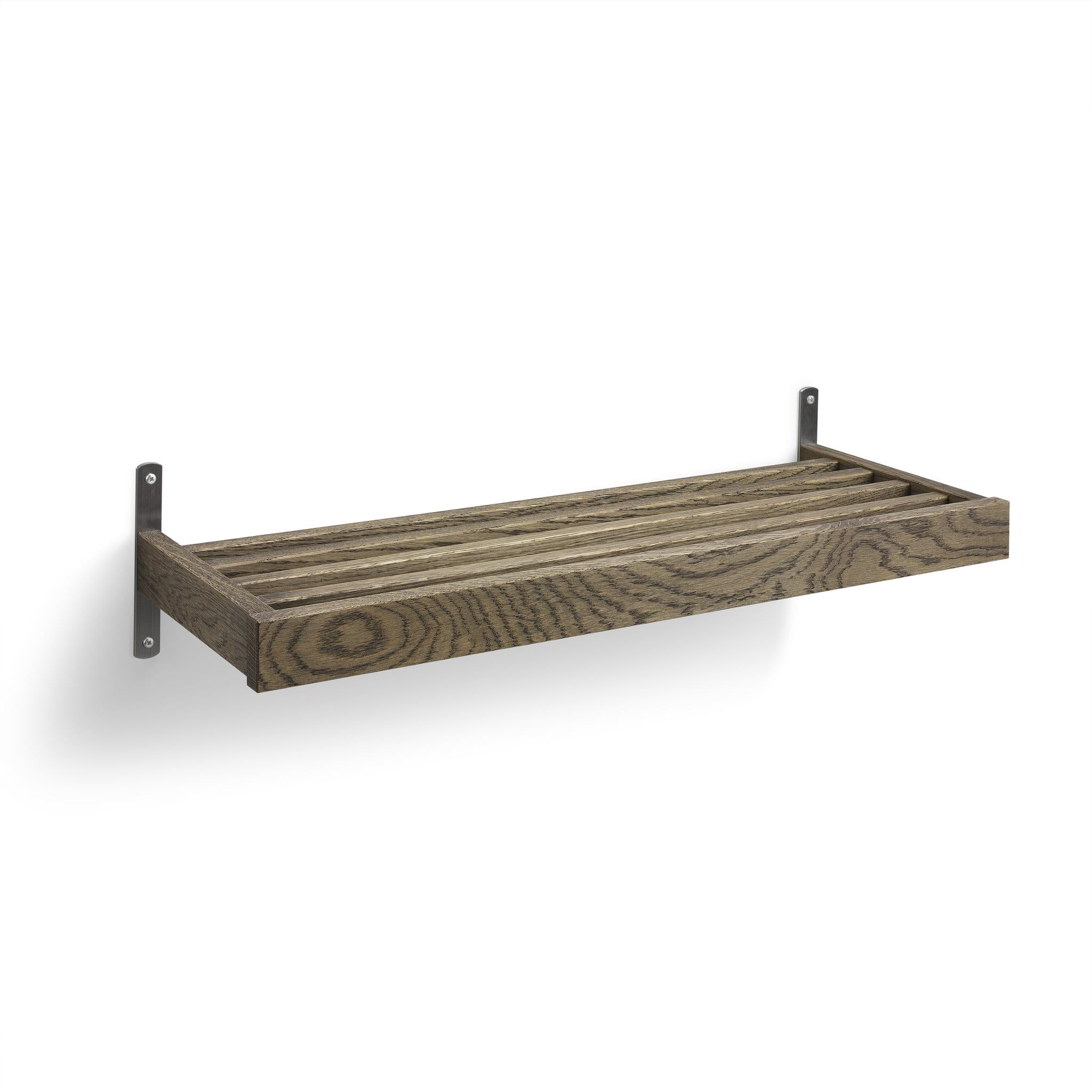 • Väggmonterad trähylla i ek med metallbeslag och ribbad design för förvaring