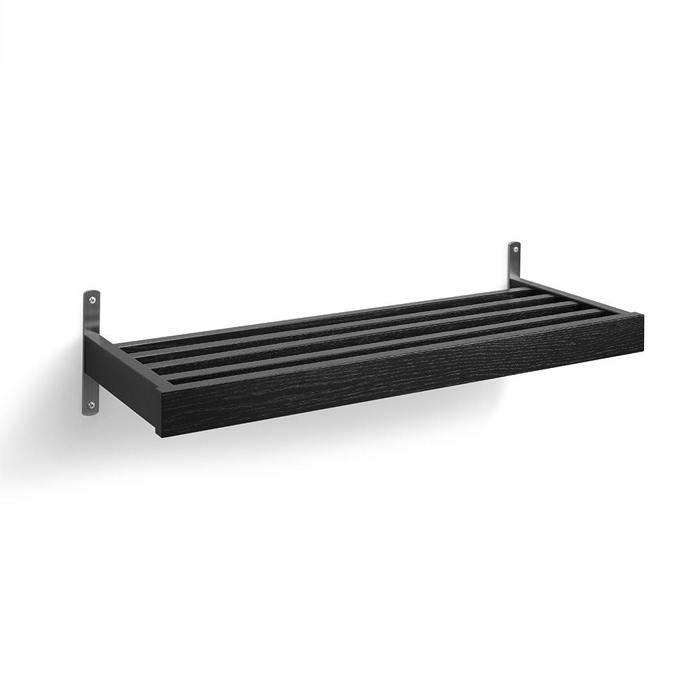 • Väggmonterad hylla i ek med svarta fästen och ribbad design