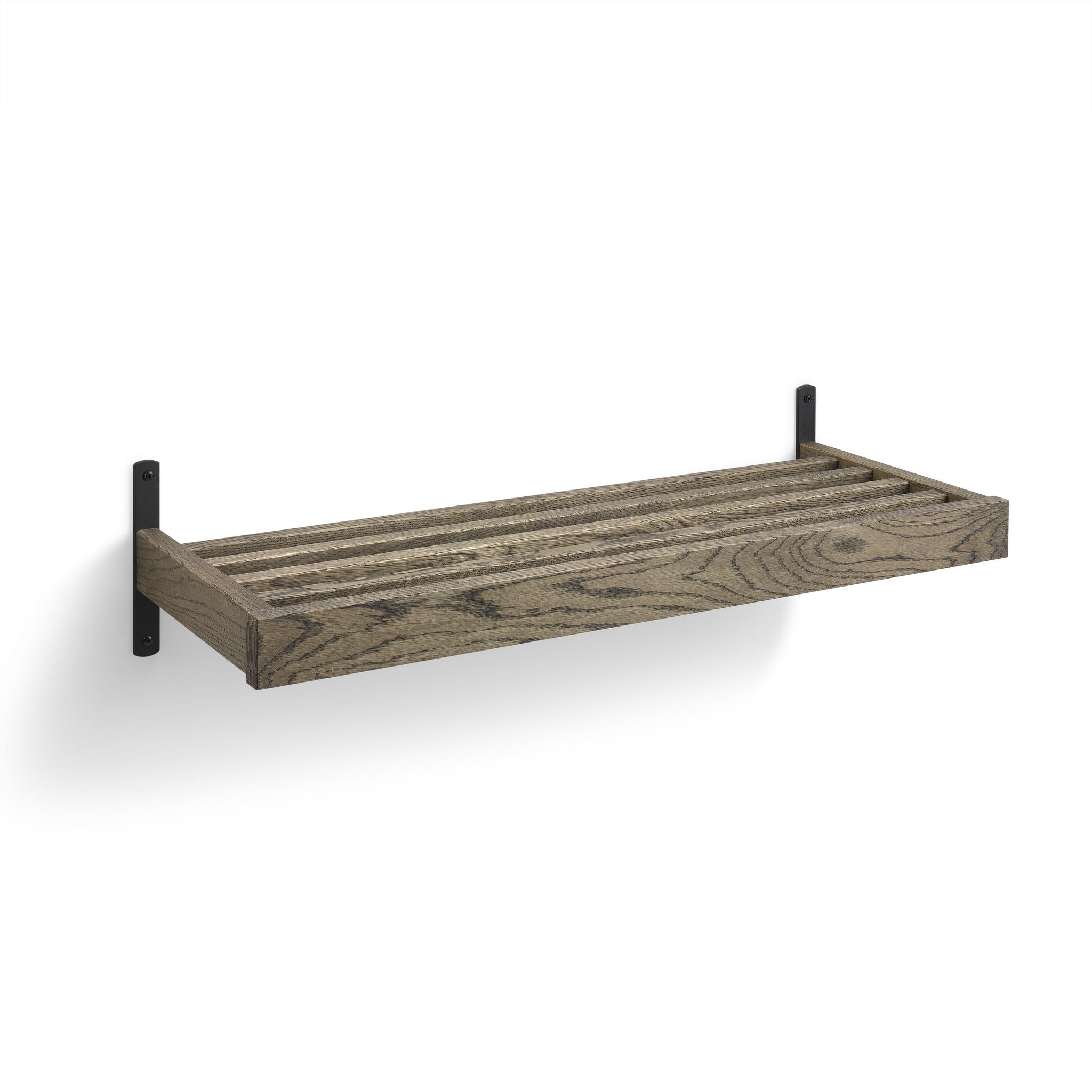 • Väggmonterad hylla i ek med ribbor och mörkgrå metallkonsoler