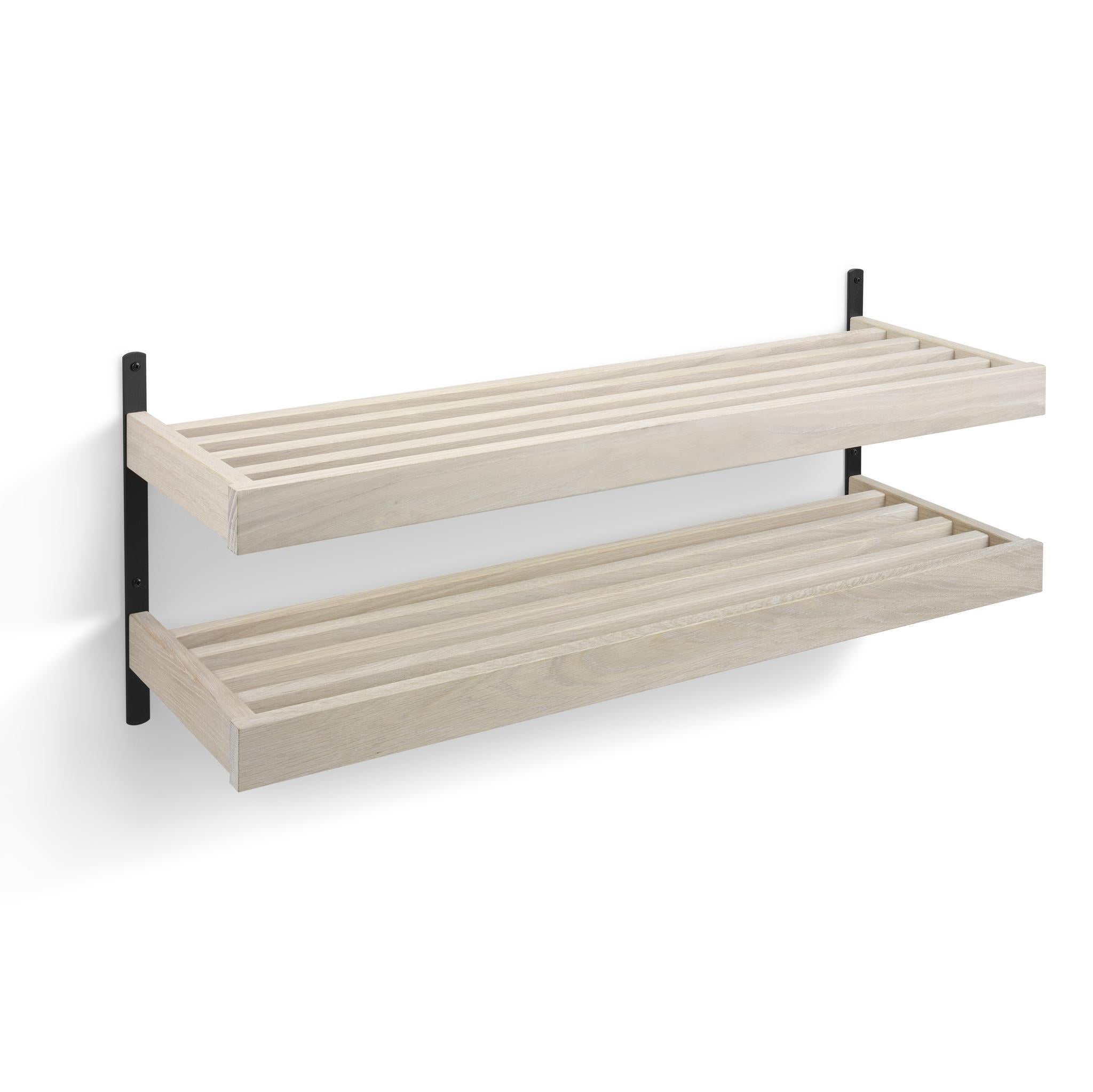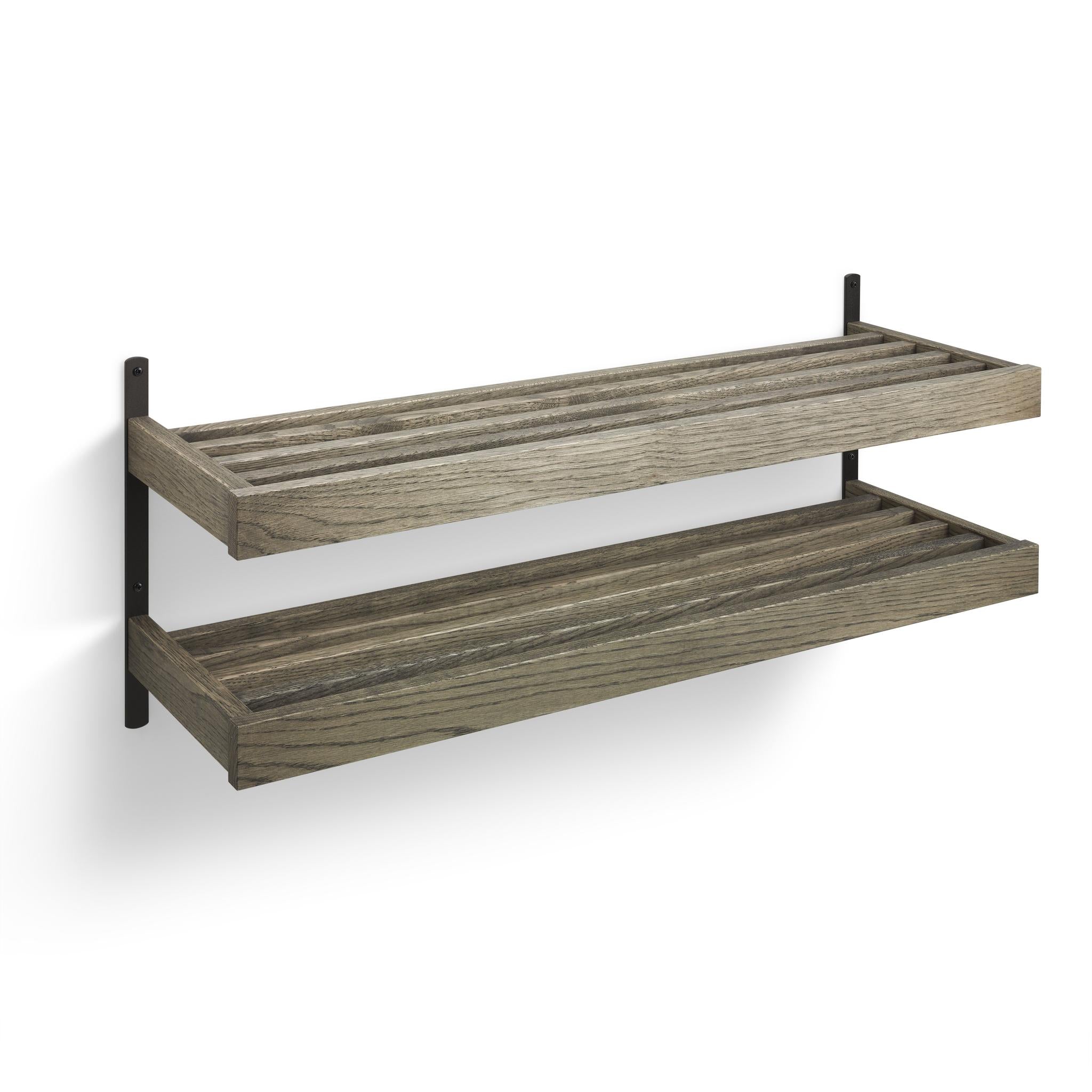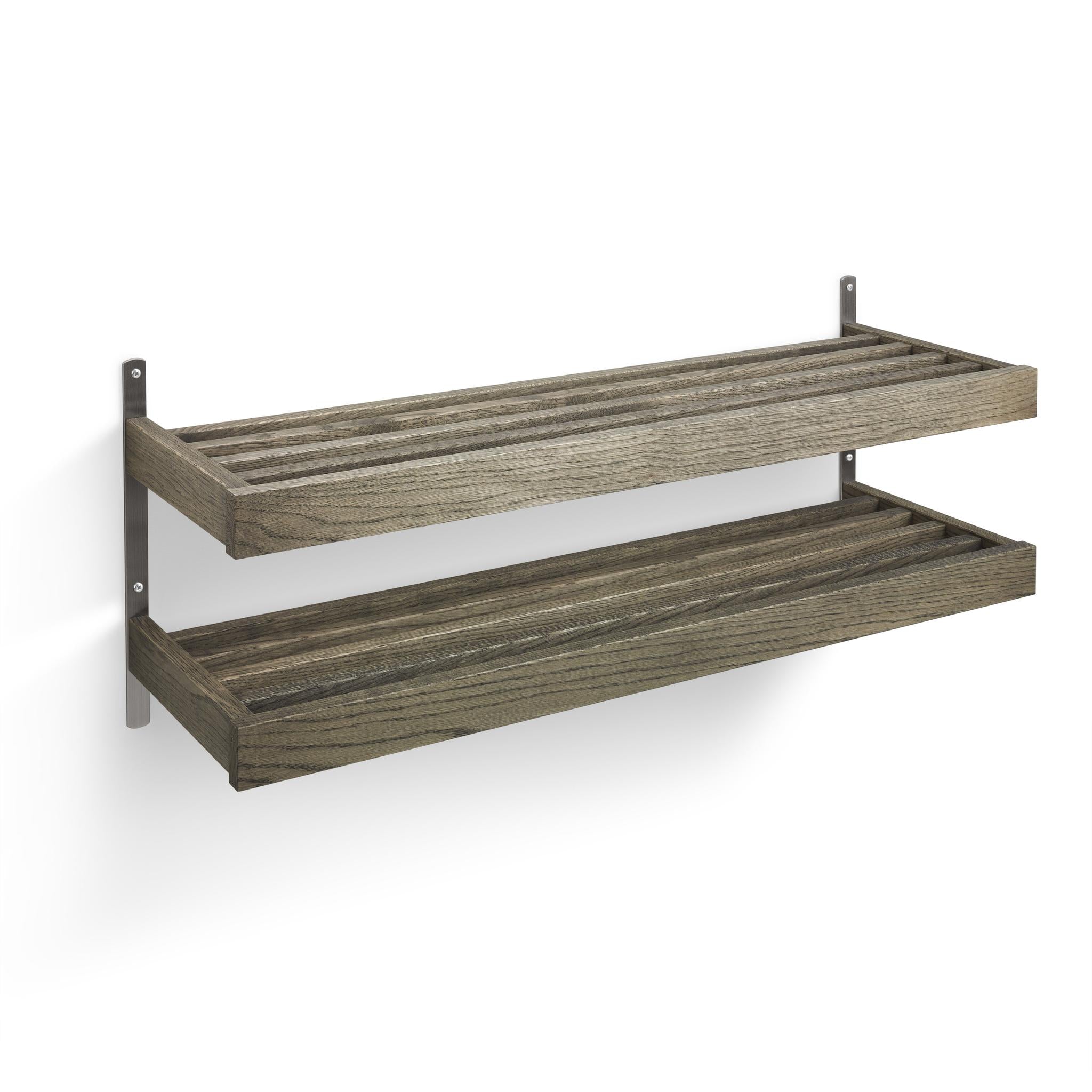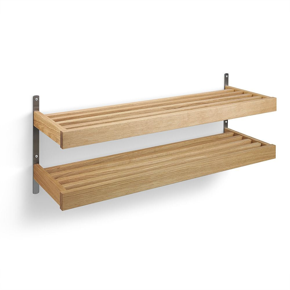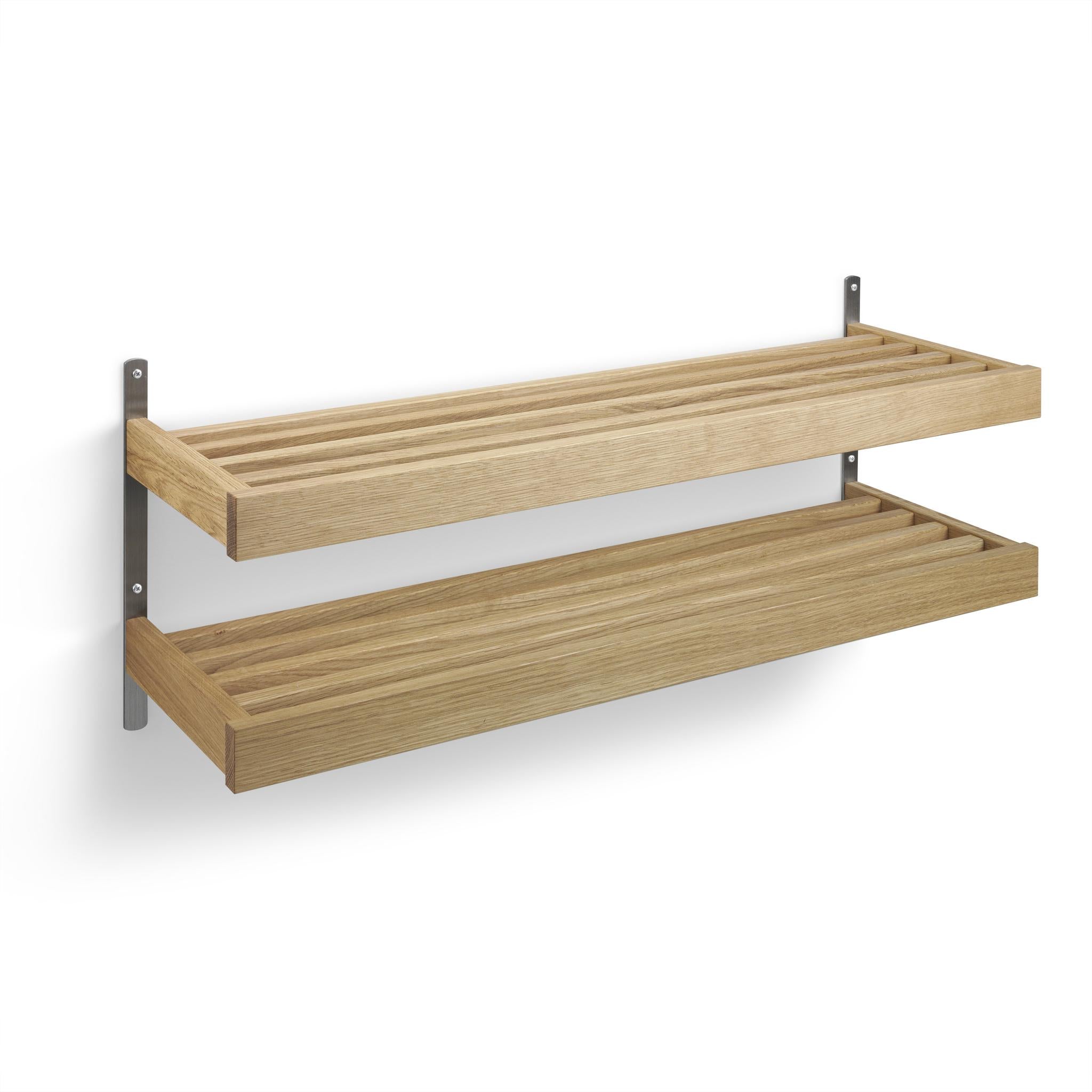 NADJA SKOHYLLA 2 PLAN VÄGG Skohylla Nadja, väggmodell med 2 hyllplan och detaljer i slipat stål eller mattsvart stål. Nadja skohylla ingår i vår möbelserie Nadja och är vår bredaste och mest populära serie, detta är möbler som kompletterar varandra och bringar karaktär till det rum de finns i. “Med en vägghängd skohylla får du det lättstädat” NADJA SKOHYLLA 2 PLAN VÄGG Skohyllan finns i längd 50 cm, 80 cm och 100 cm. Slipat stål Mattsvart stål