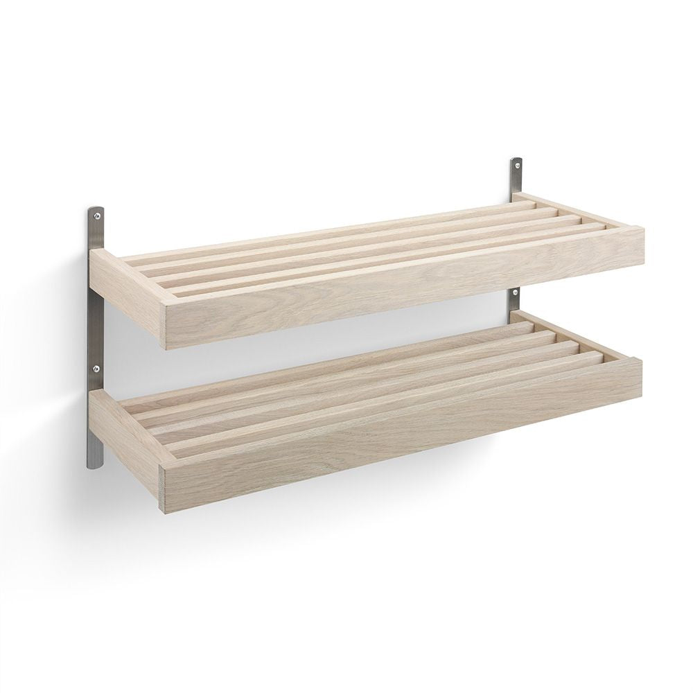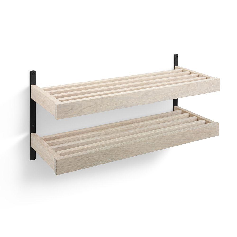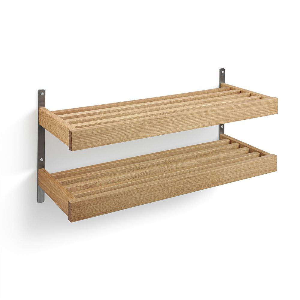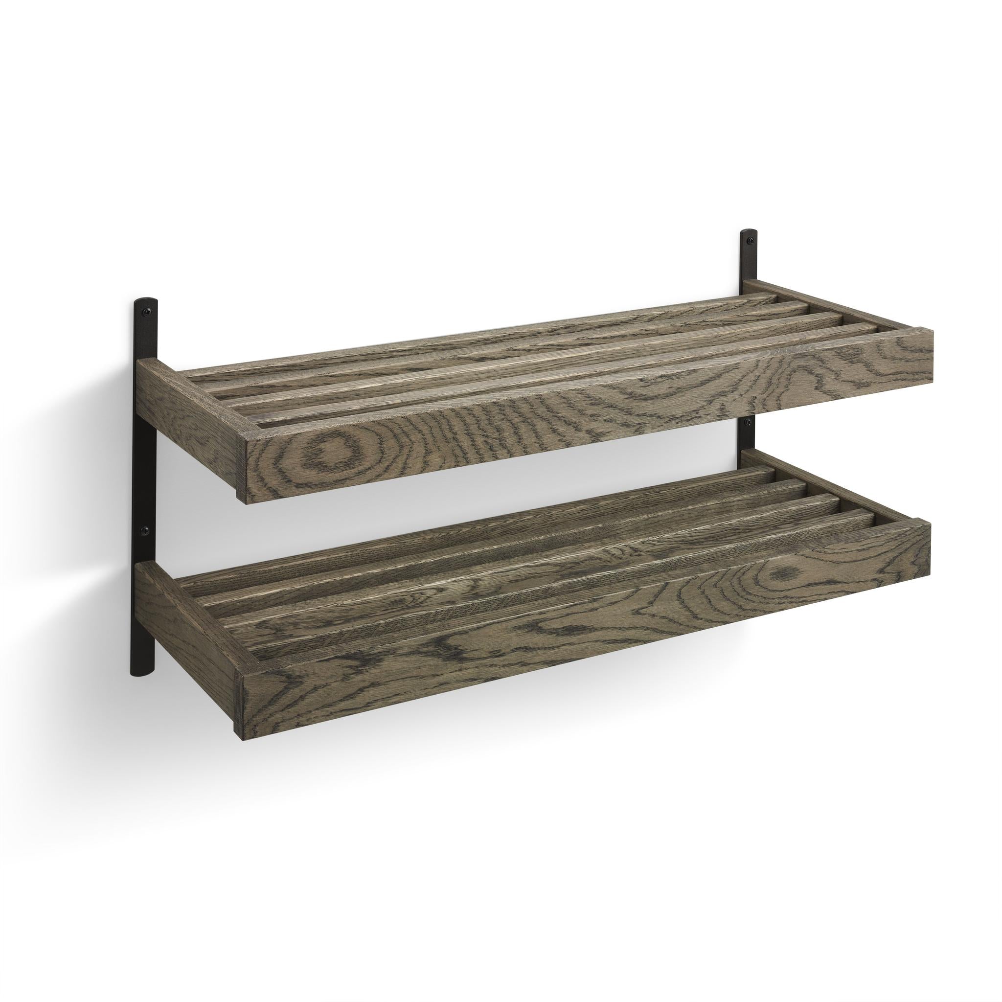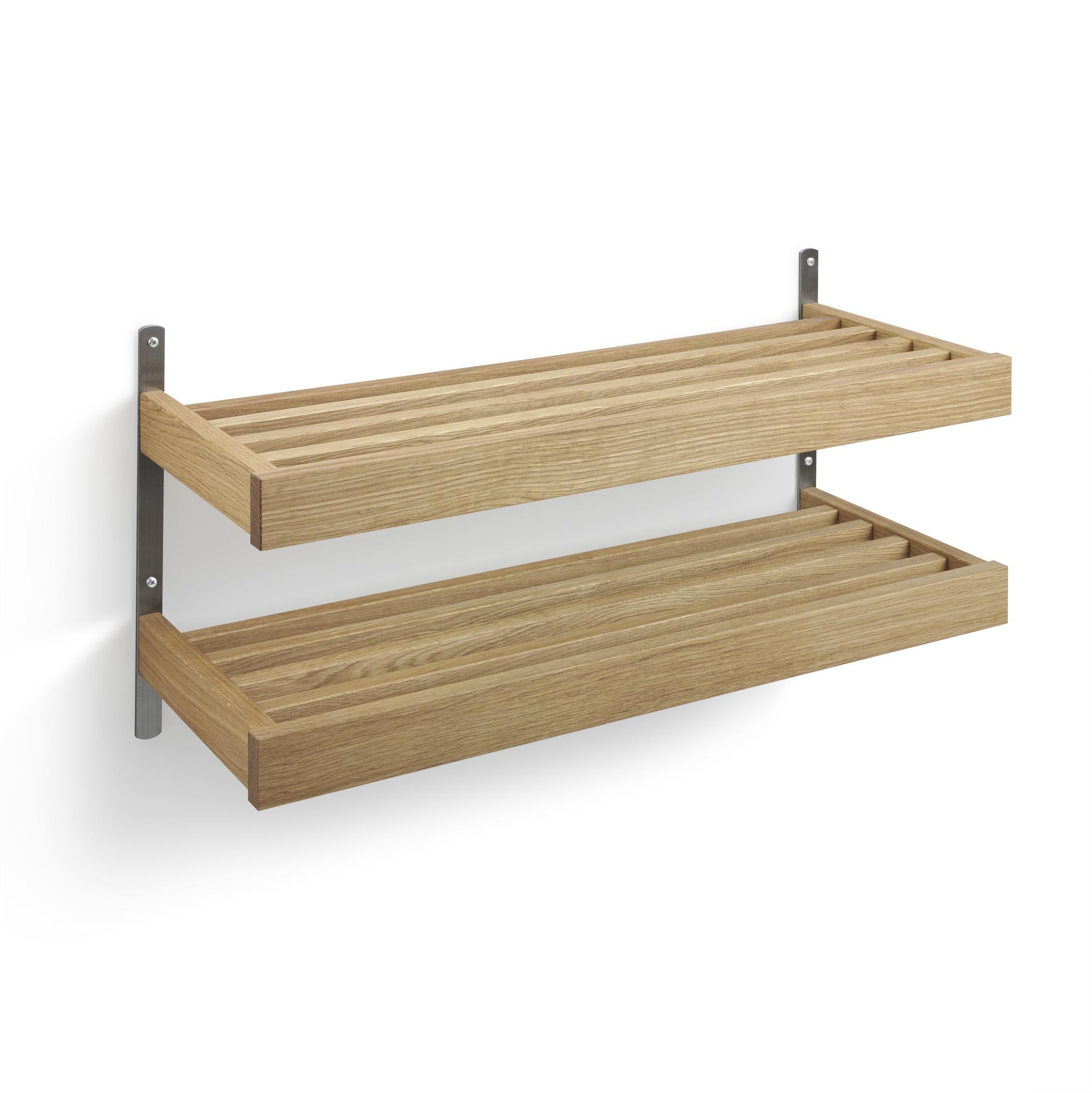 • Väggmonterad dubbel skohylla i ek med metallfästen och ribbor för ventilation