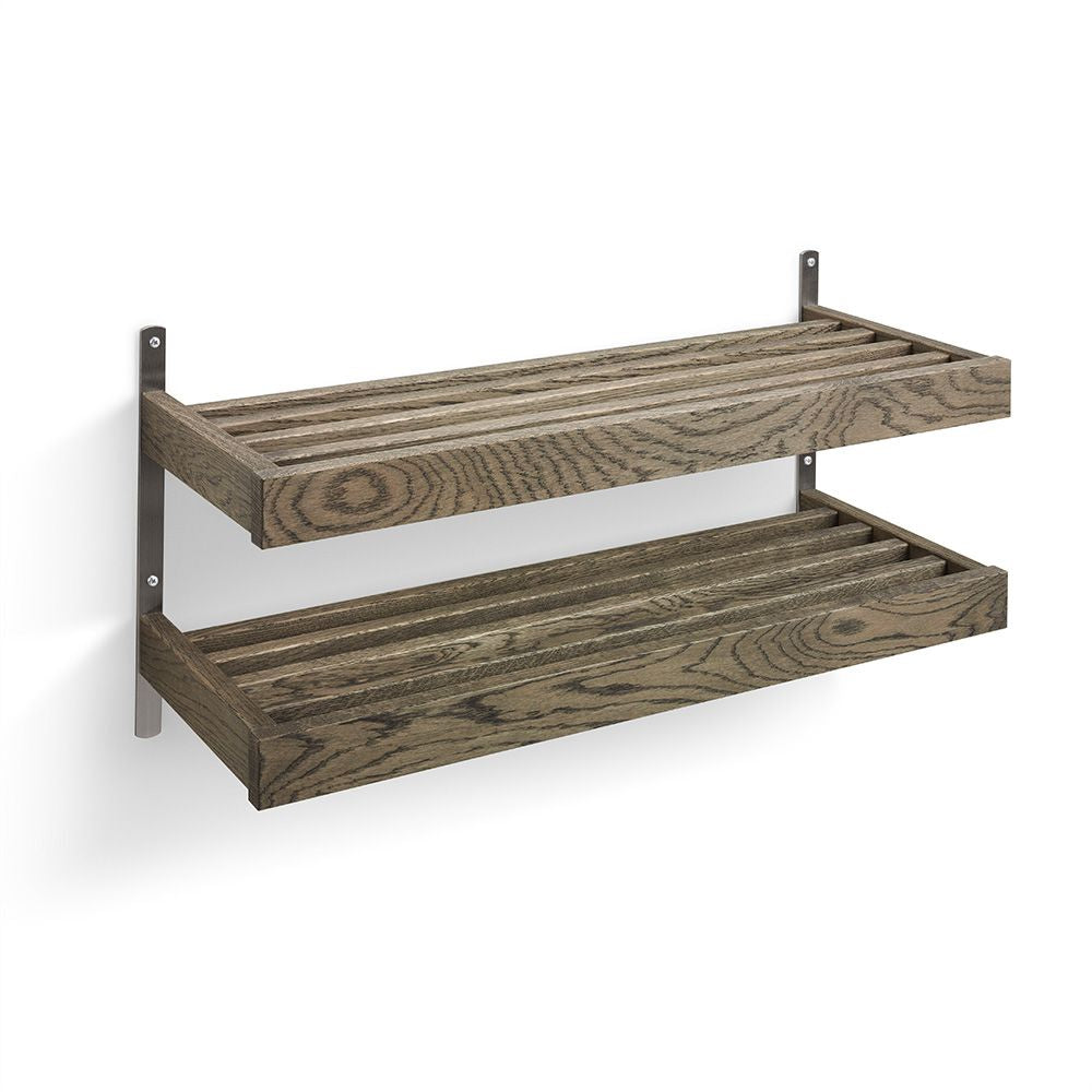 • Väggmonterad skohylla i ek med två nivåer och grå metallbeslag för förvaring av skor