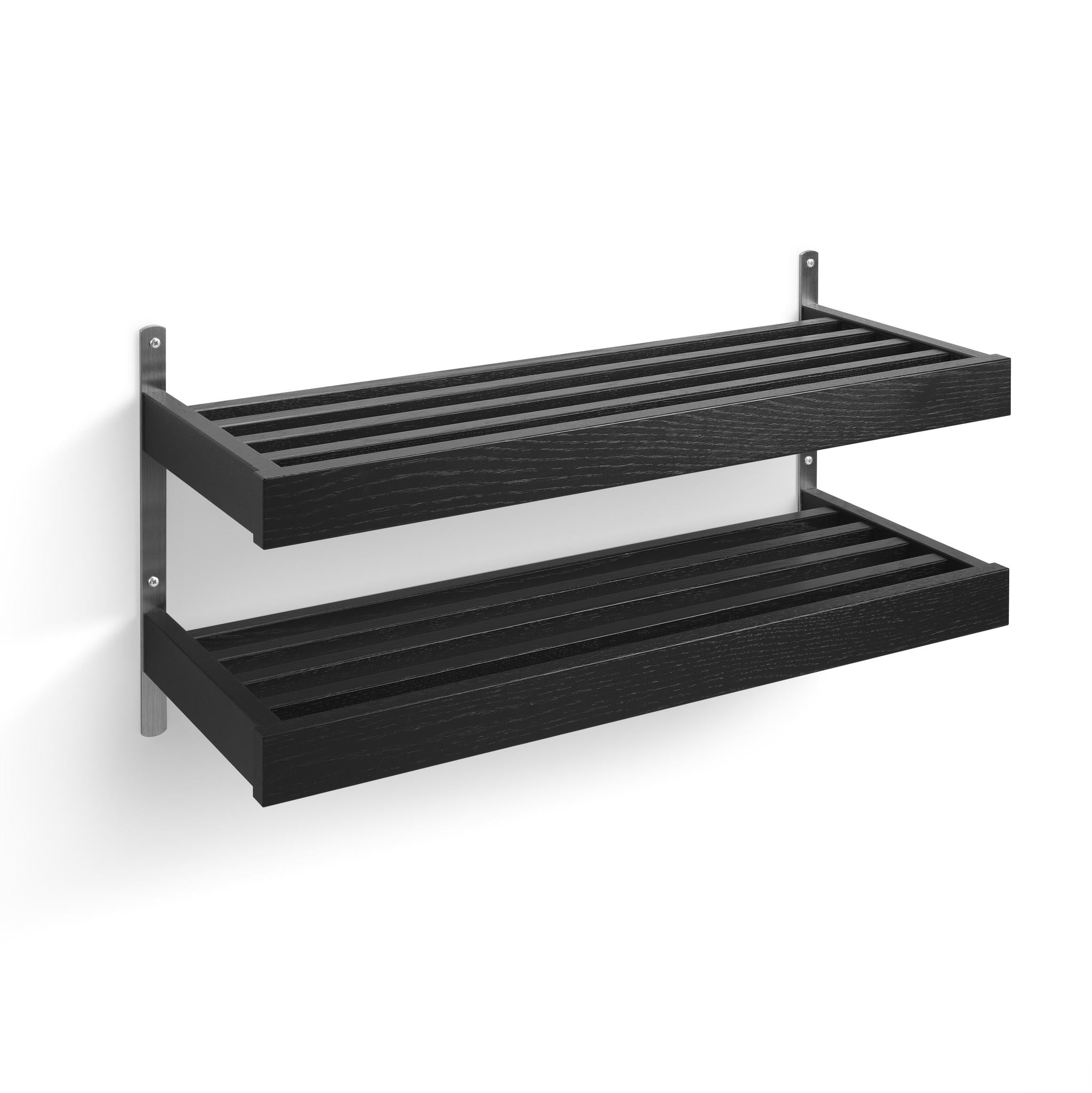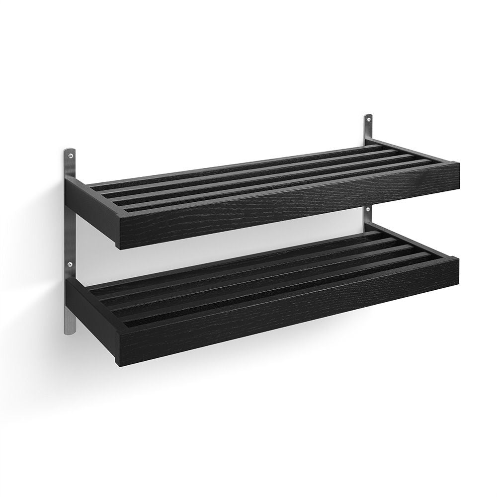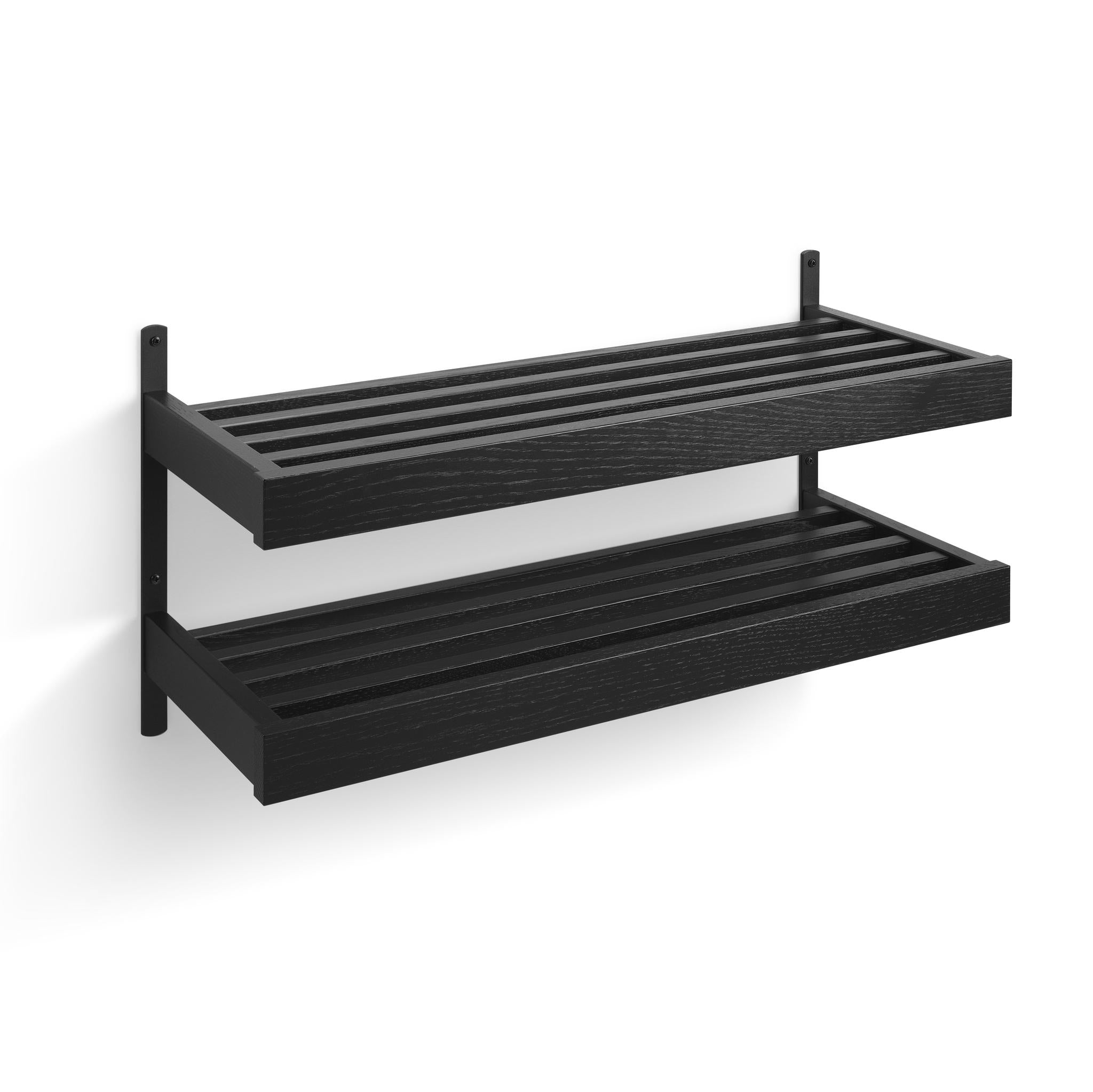 • Svart vägghängd skohylla med två nivåer i trä och metallbeslag för skoförvaring