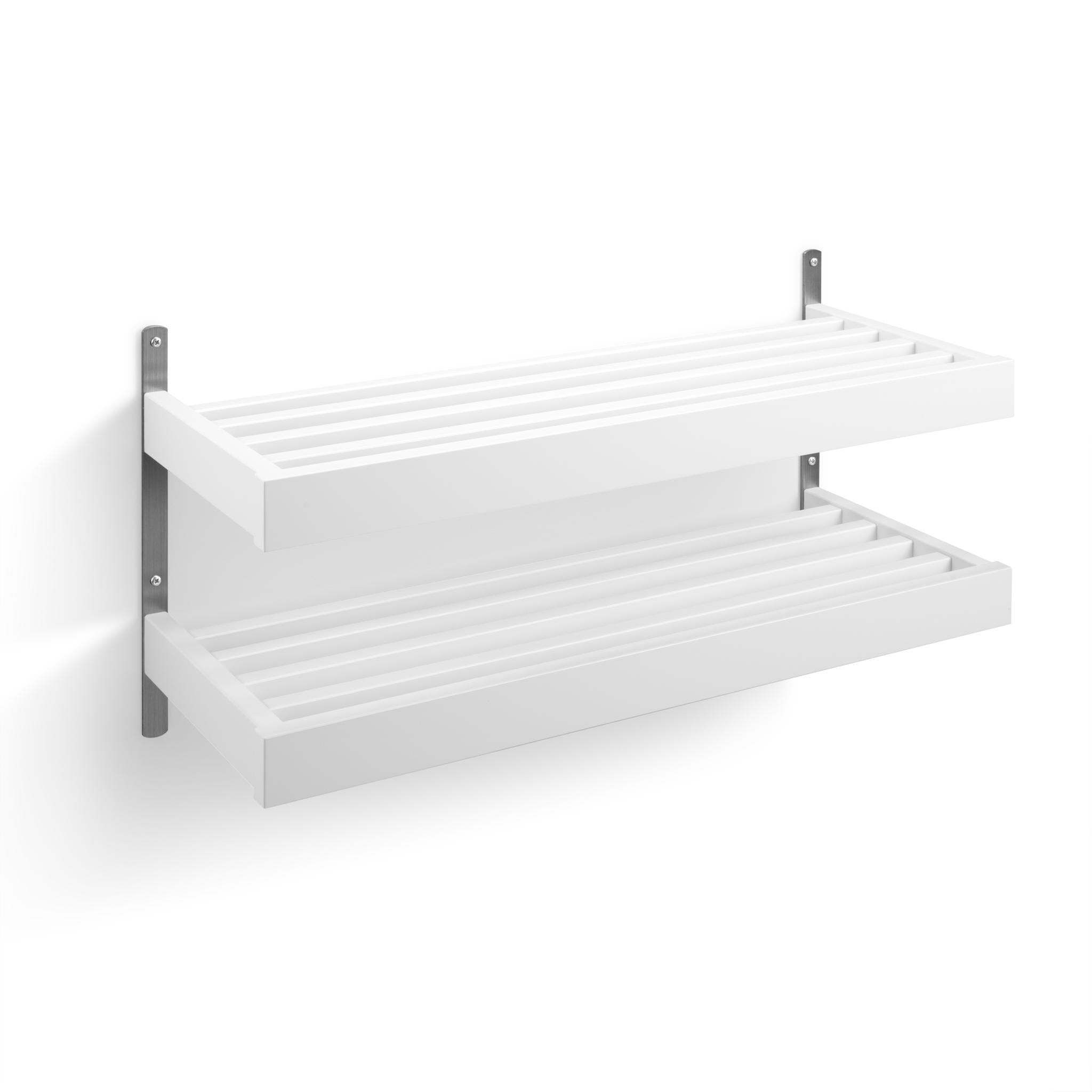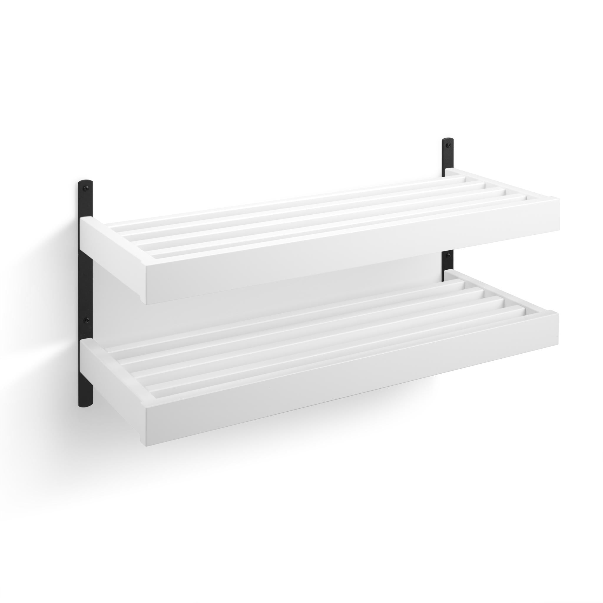 • Vit väggmonterad skohylla med två nivåer och grå fästen för smart förvaring