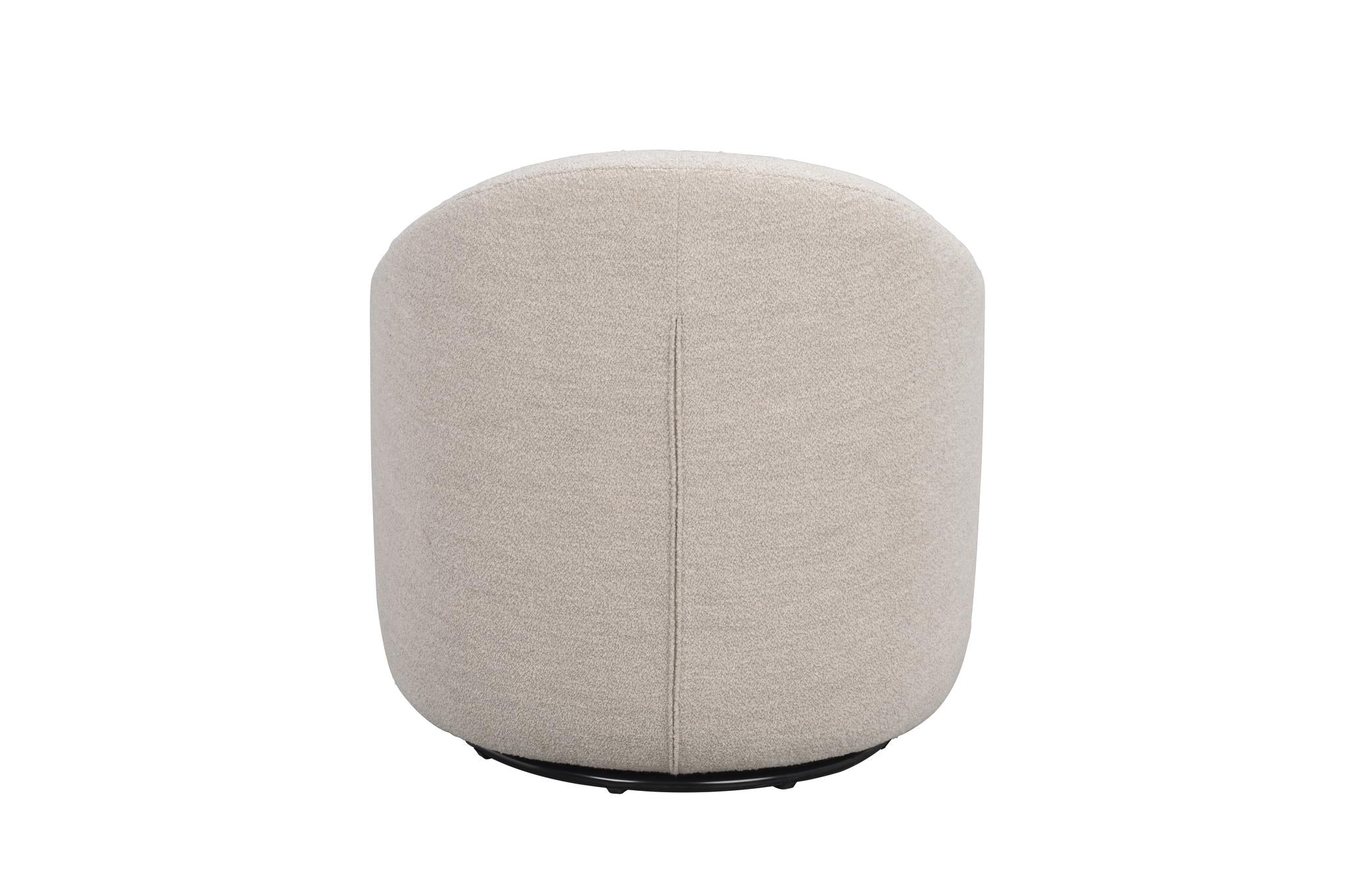 • Beige svängbar fåtölj med rundad rygg och mjuk klädsel i bouclétyg