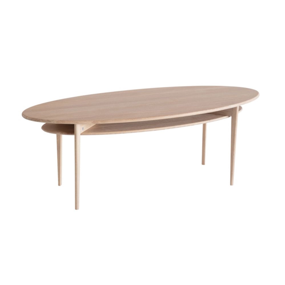 • Ovalt soffbord i ljust trä med hylla och smala ben i skandinavisk design