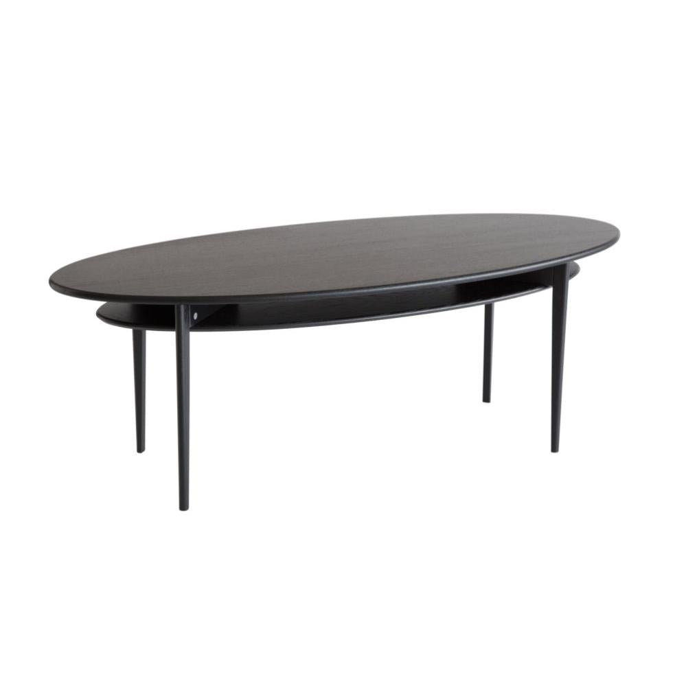 • Svart ovalt soffbord i trä med smala ben och modern skandinavisk design