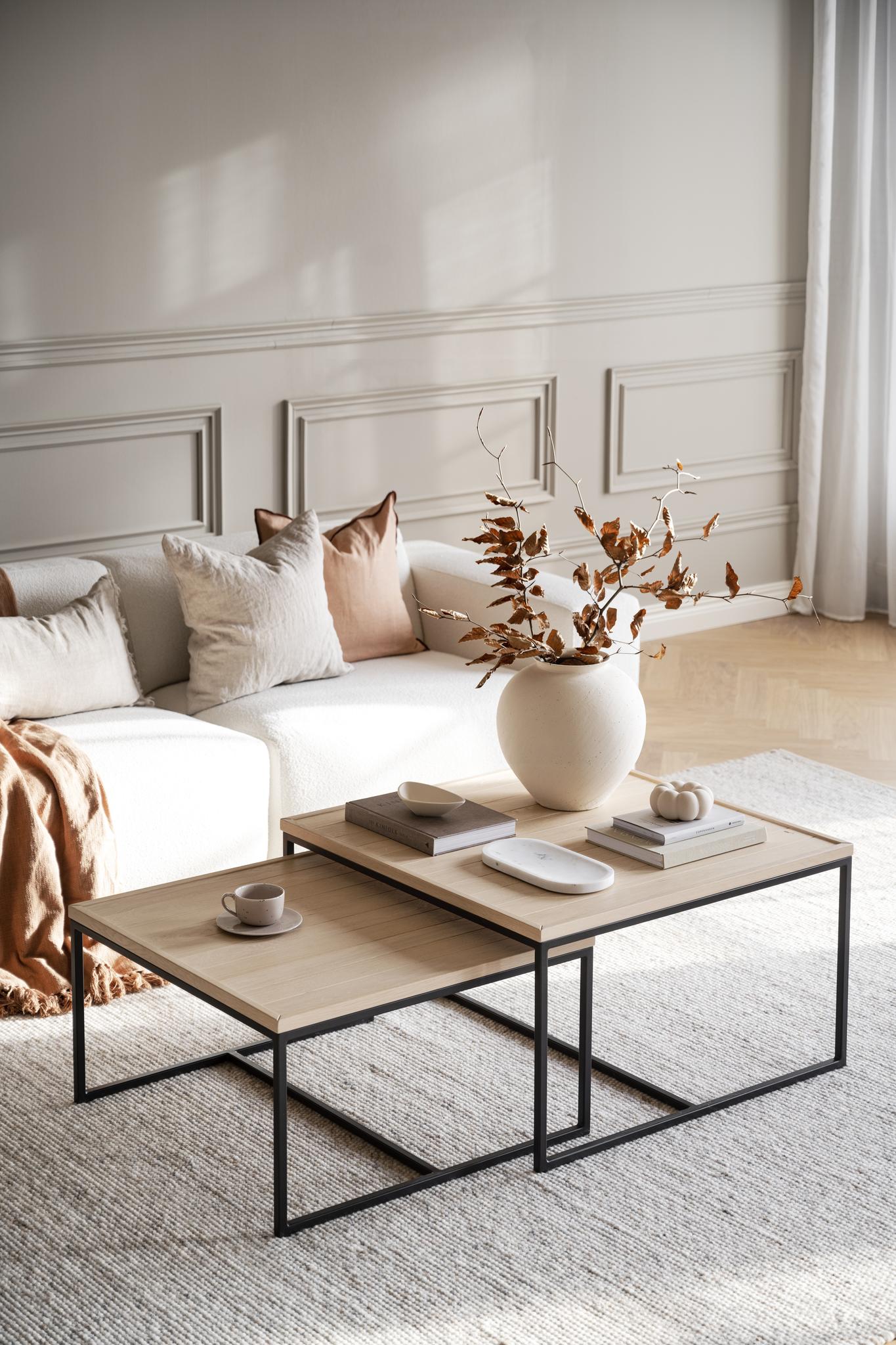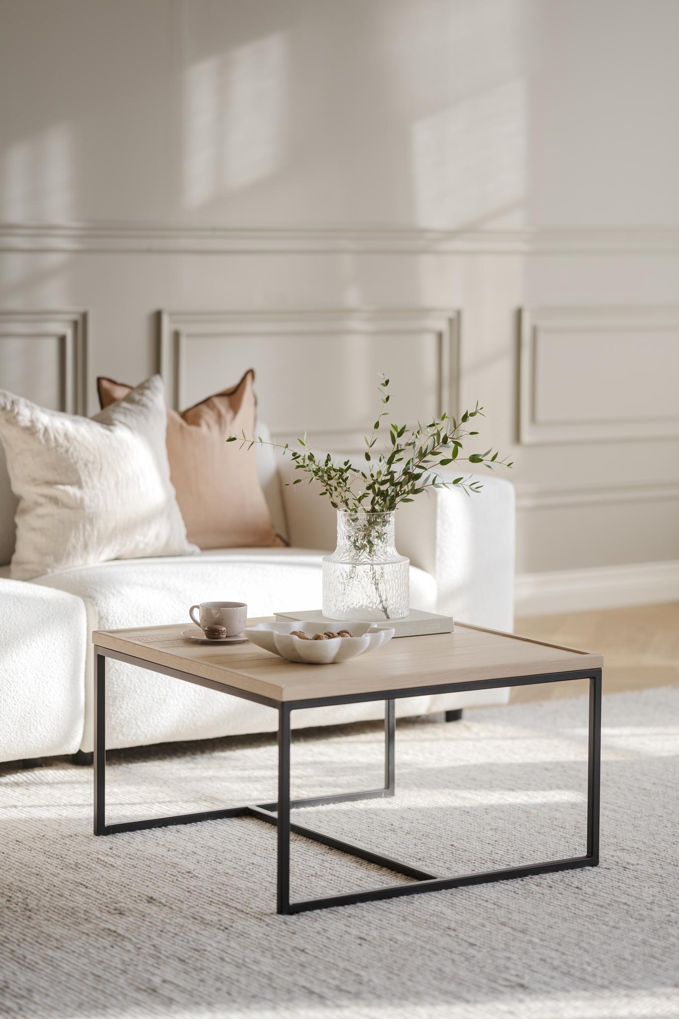 • Soffbord i ljust trä med svarta metallben, stilrent vardagsrum med vit soffa och beige kuddar