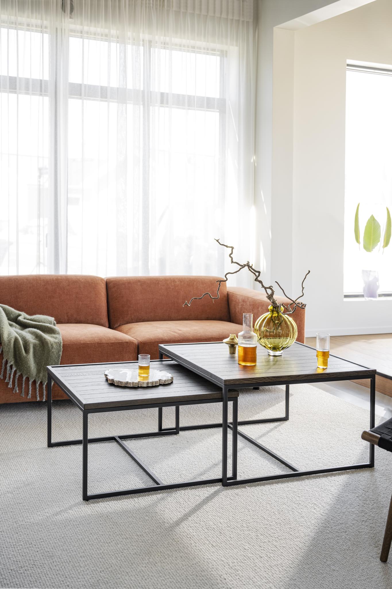 • Soffbord i set med svart metallram och träskiva framför terrakottafärgad soffa i ljust vardagsrum