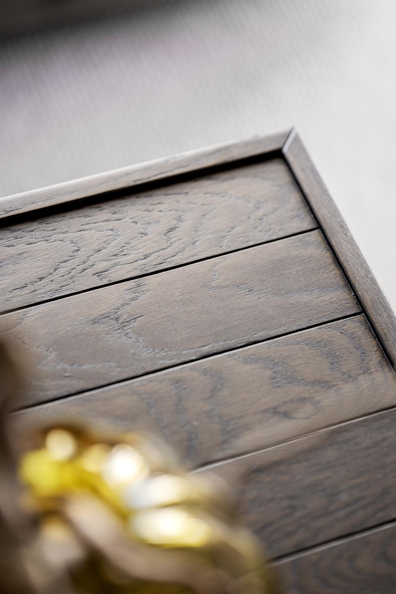 • Närbild på mörkgrå träkommod med synlig trästruktur och guldigt dekorativt föremål i förgrunden