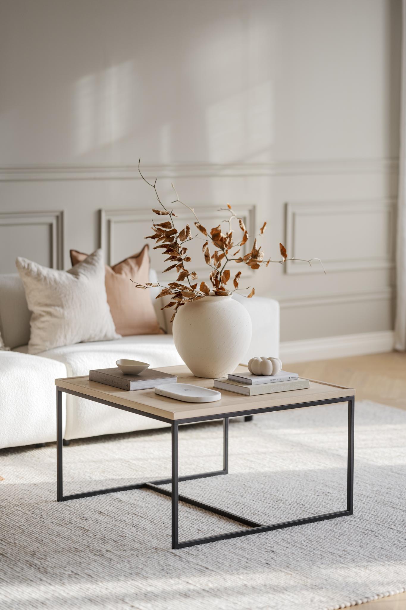 • Soffbord i ljust trä med svart metallram, två storlekar, skandinavisk design i vardagsrum med beige soffa