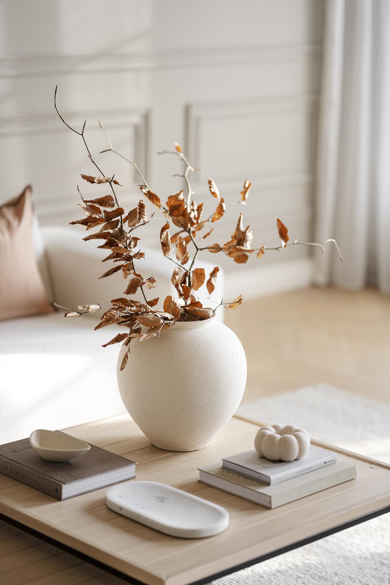 • Cremefärgad keramikvas med torkade bruna löv på träbord med böcker och dekorativa skålar i ljust vardagsrum