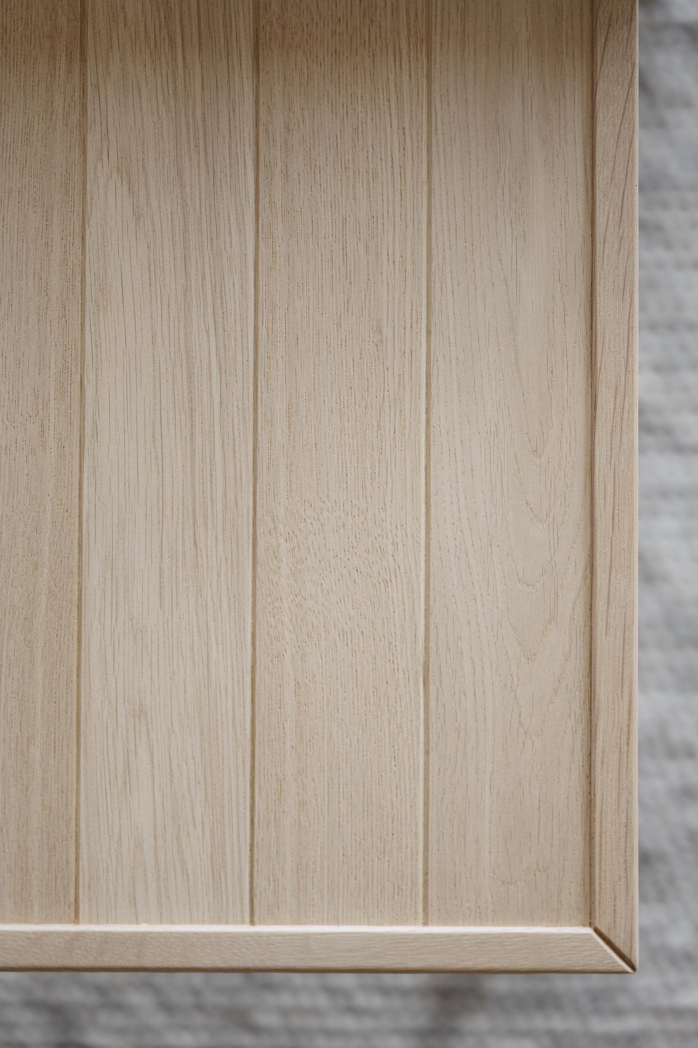 • Ljus träskåpslucka med synlig träådring och ram i naturligt trä