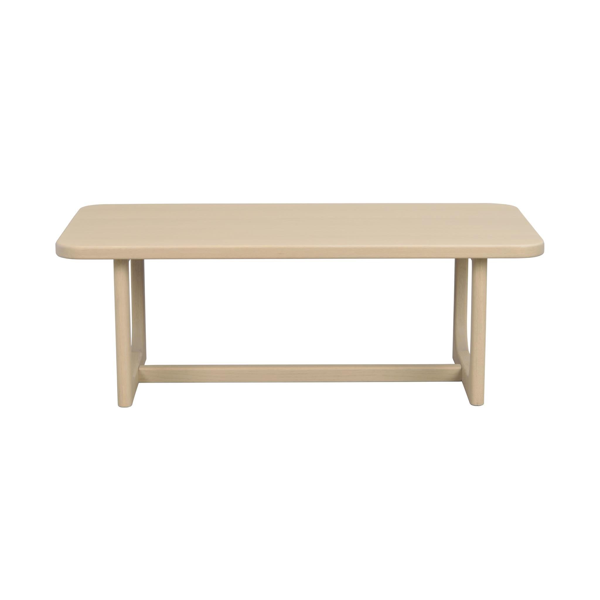 • Beige soffbord i trä med rundade hörn och böjda ben med genomgående sidostag