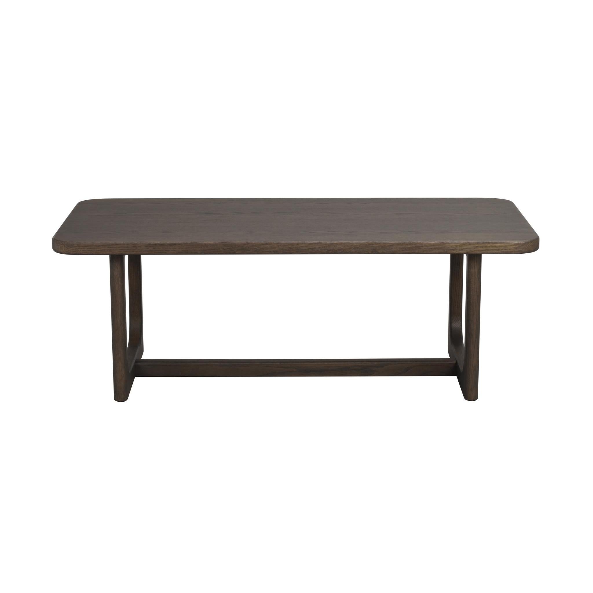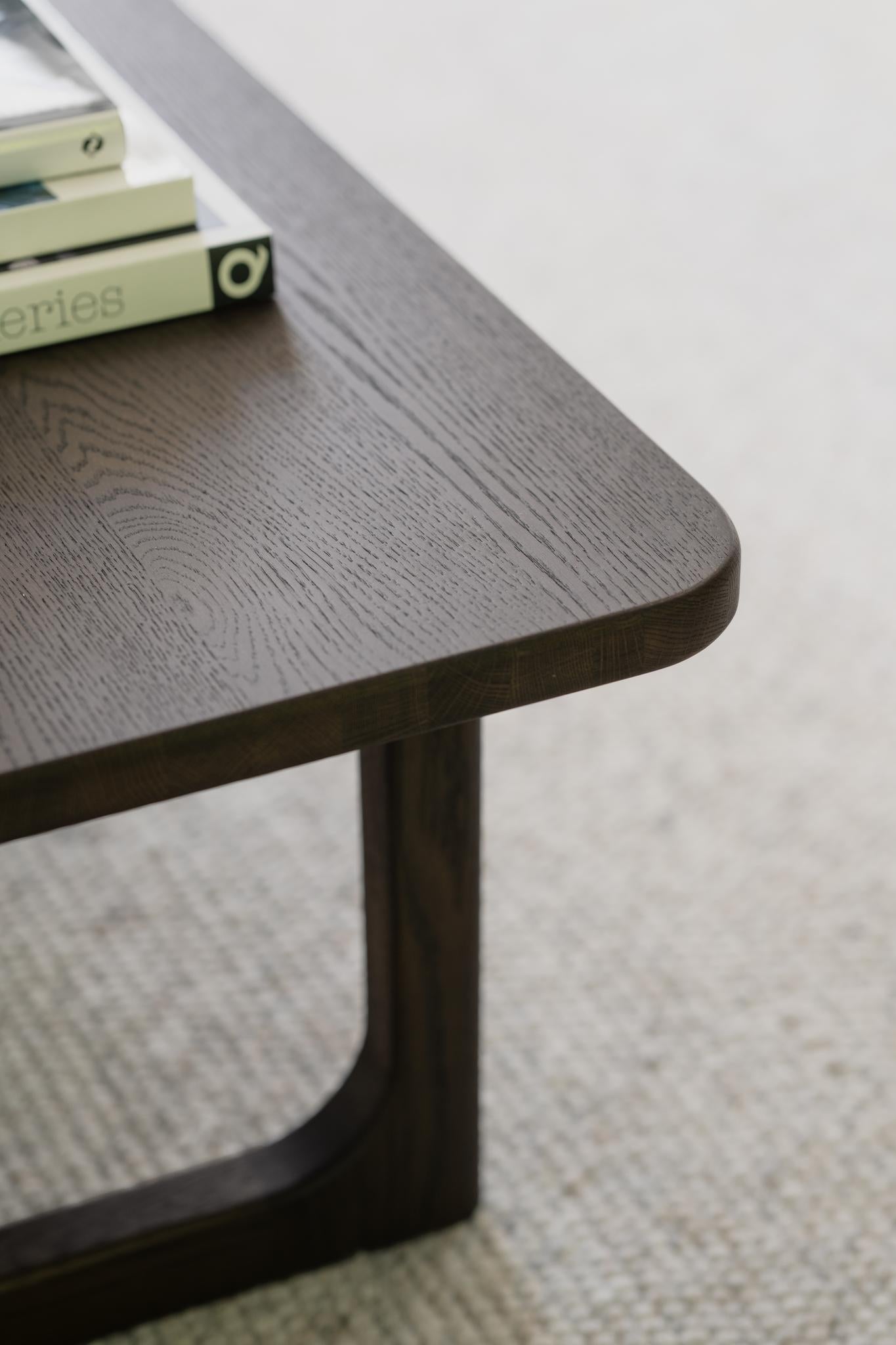 • Rektangulärt soffbord i mörkbrun ek med rundade hörn och U-formade ben med horisontell förstärkning