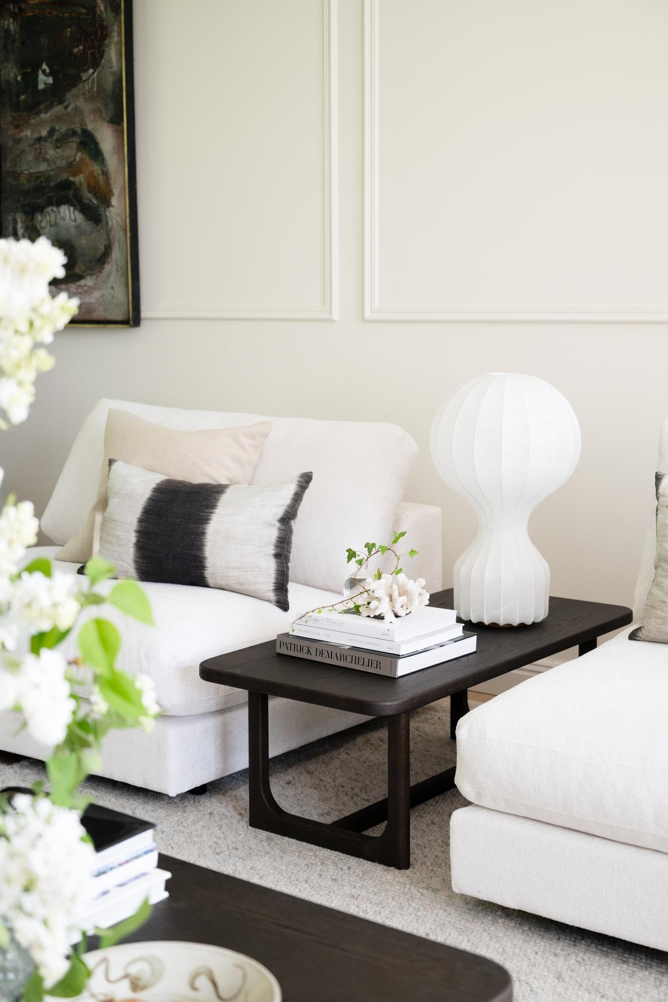 • Modernt vardagsrum med vit soffa, svart soffbord, vit skulpturlampa och dekorativa kuddar i neutrala färger