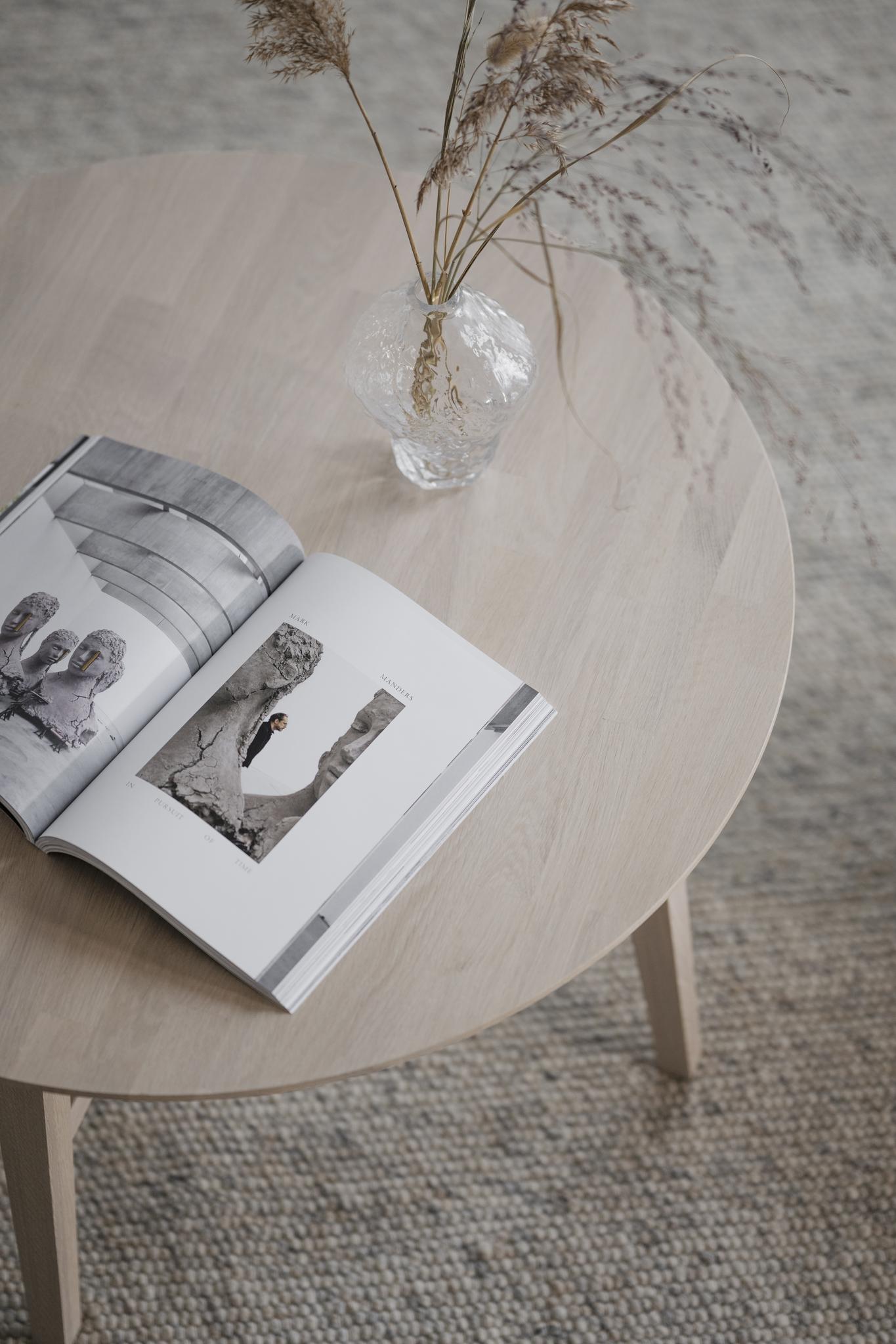 • Runt soffbord i ljust trä med öppen bok och glasvas med torkade gräs i minimalistisk inredning