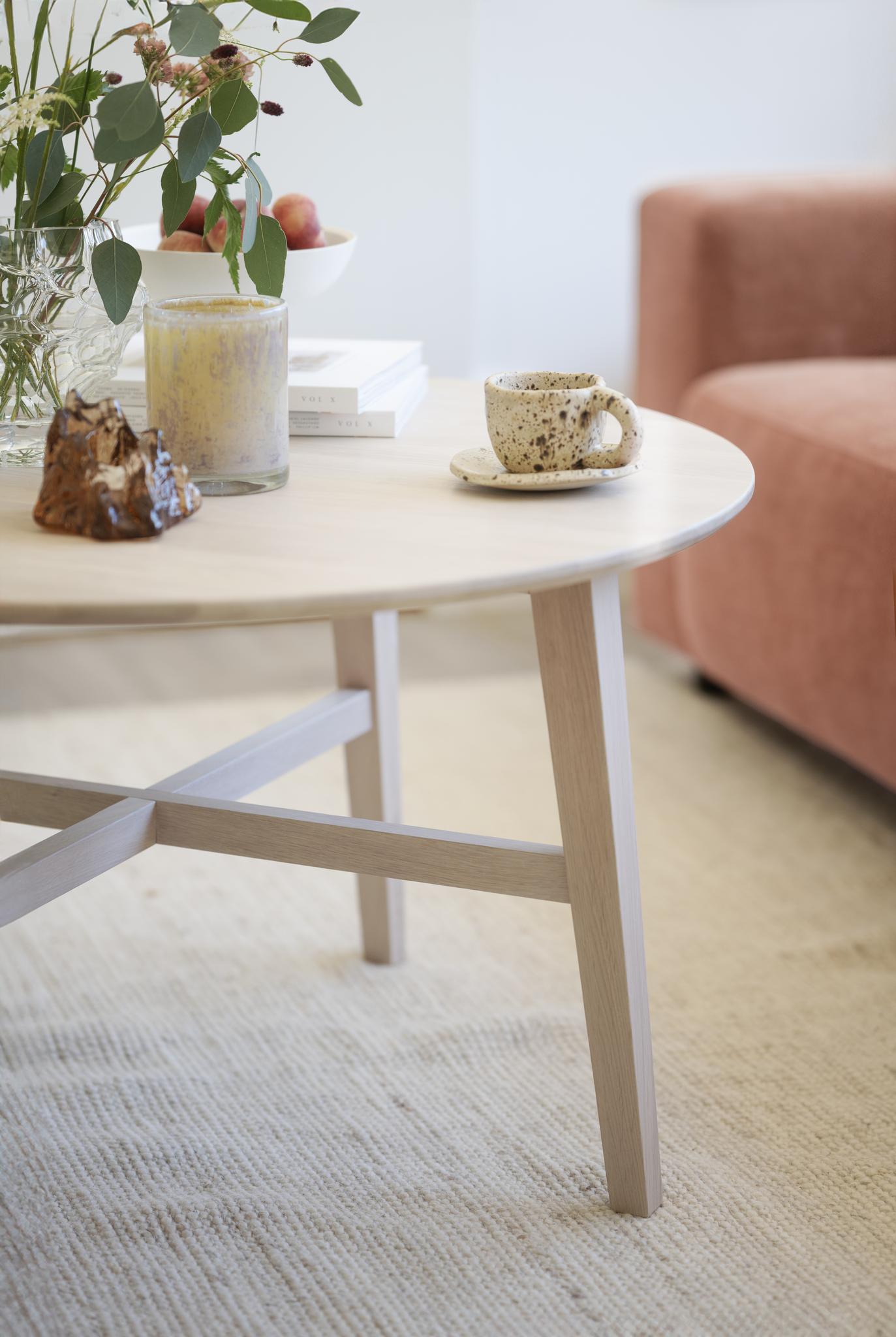 • Runt soffbord i ljust trä med vita ben, dekorerat med spräcklig keramikmugg, vas och ljus på matta