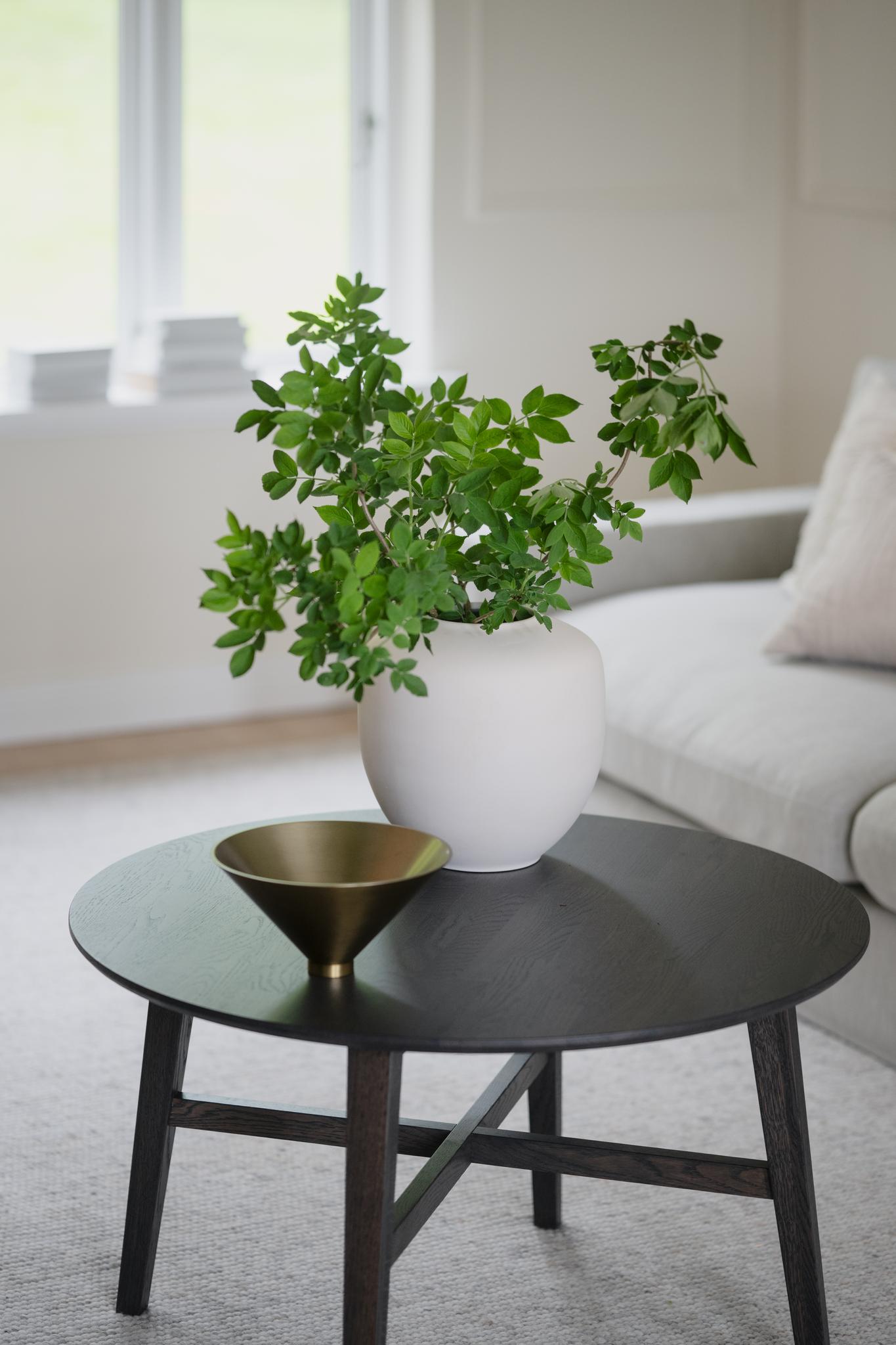 • Soffbord i mörkt trä med konisk metallskål i mässing och vit vas med grön växt