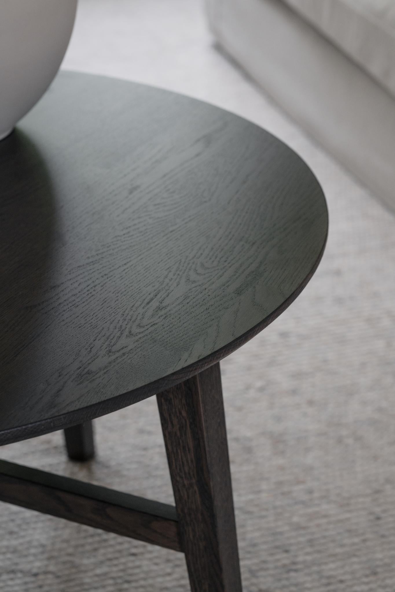 • Soffbord med rund bordsskiva i mörkbetsad ek och träben, fotograferat från sidan