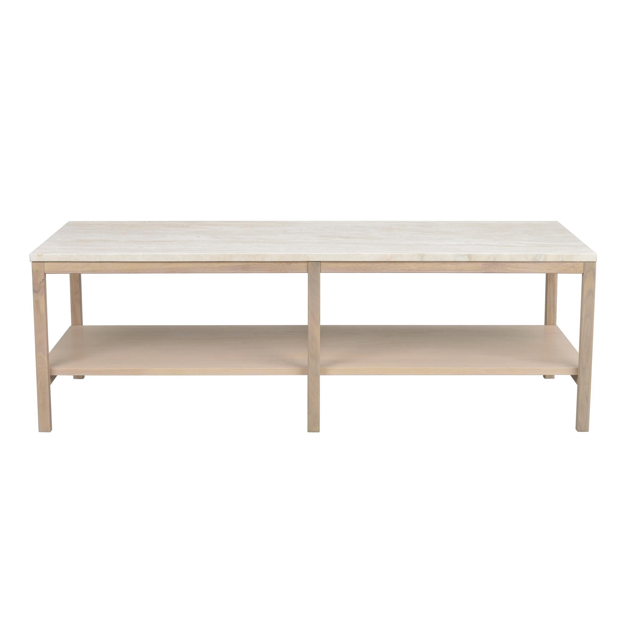 Massiv italiensk travertin sten i toppen, ben och stomme i massiv ek, hyllplan i MDF med ekfanér.