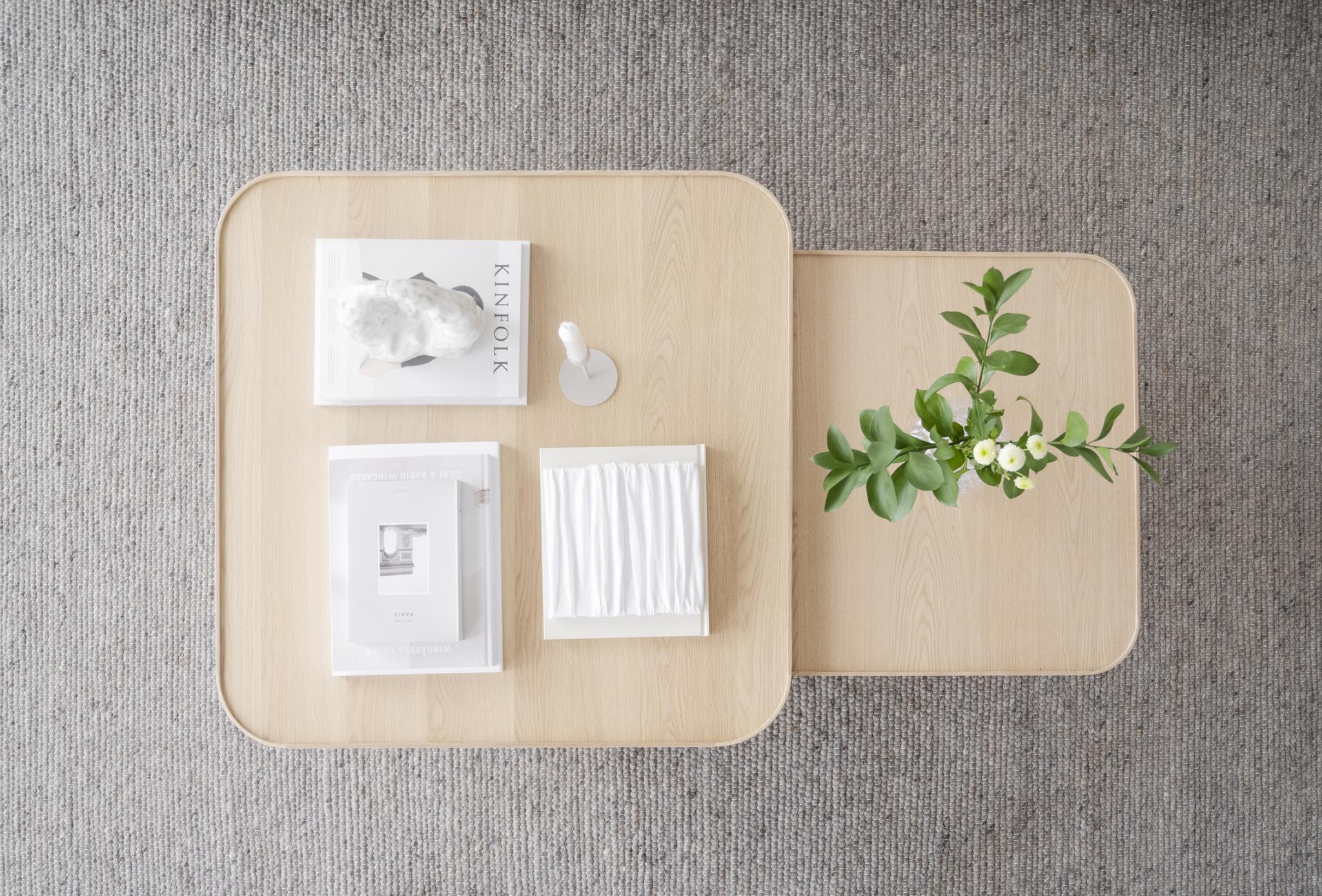 • Två träbord i ljus ek med rundade hörn, det mindre bordet har en grön växt, ovanifrån på grå matta