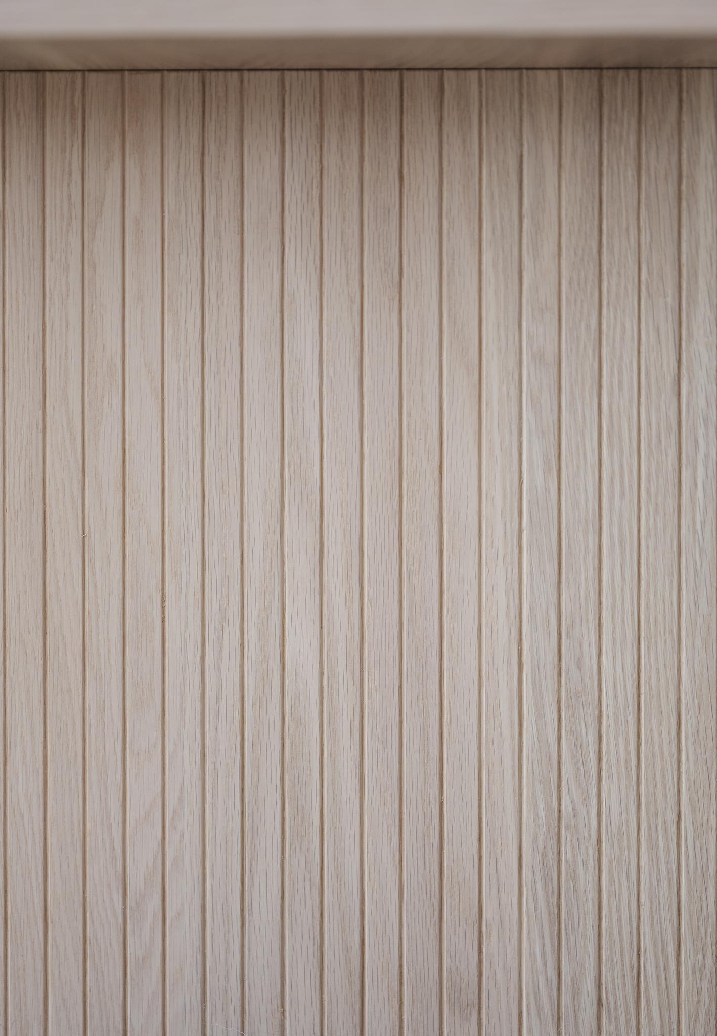 • Ljus ekfanerad skåpsdörr med vertikala spår och naturlig trästruktur