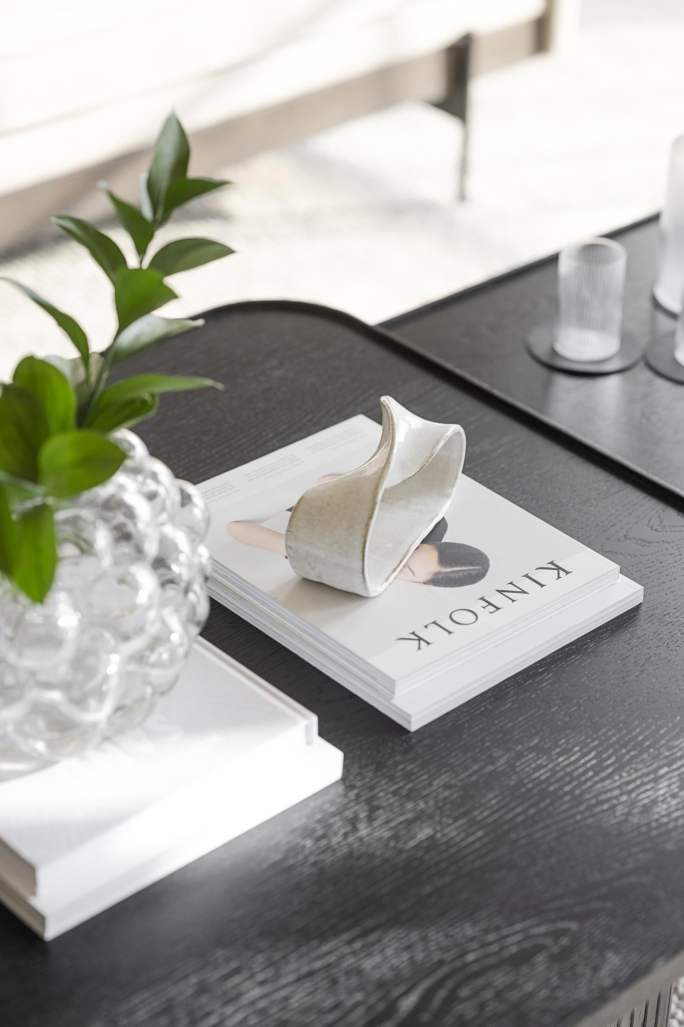• Vit dekorativ skål i form av blad på Kinefolk-bok, placerad på mörkt soffbord med växt och glas