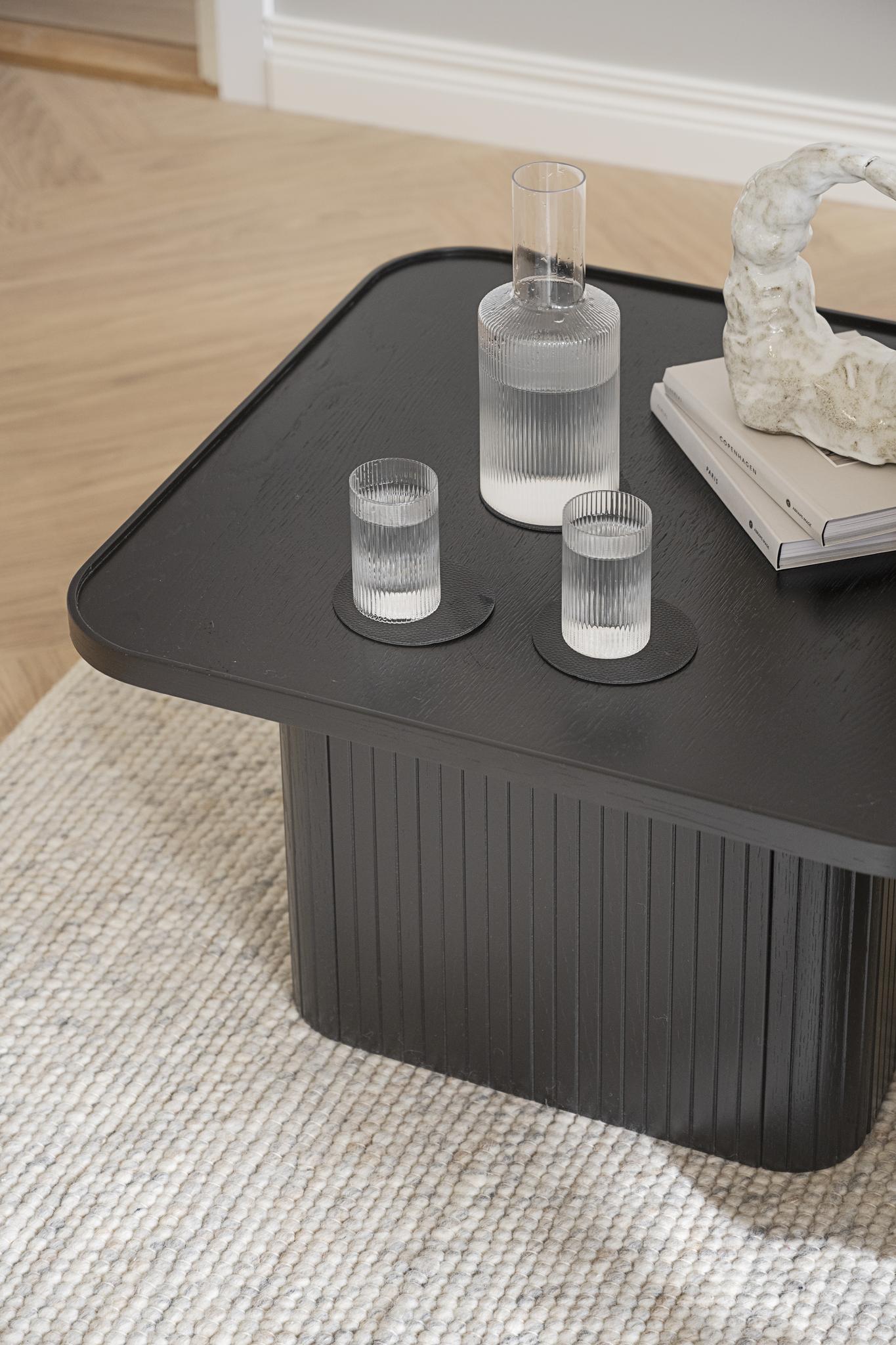 • Svart soffbord med räfflad design, dekorerat med glaskaraff och glas på beige matta