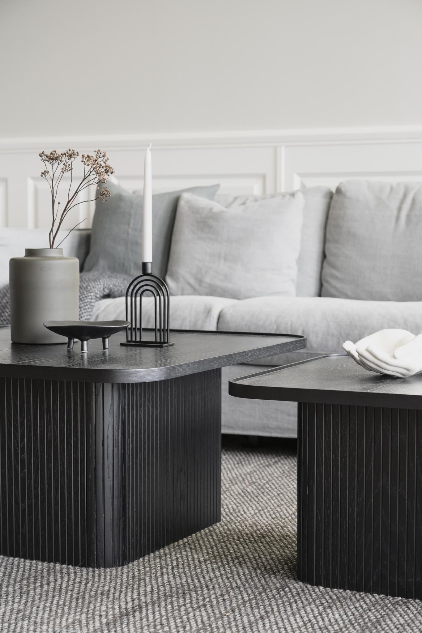 • Svarta soffbord med räfflad design och ljusgrå soffa i minimalistiskt vardagsrum