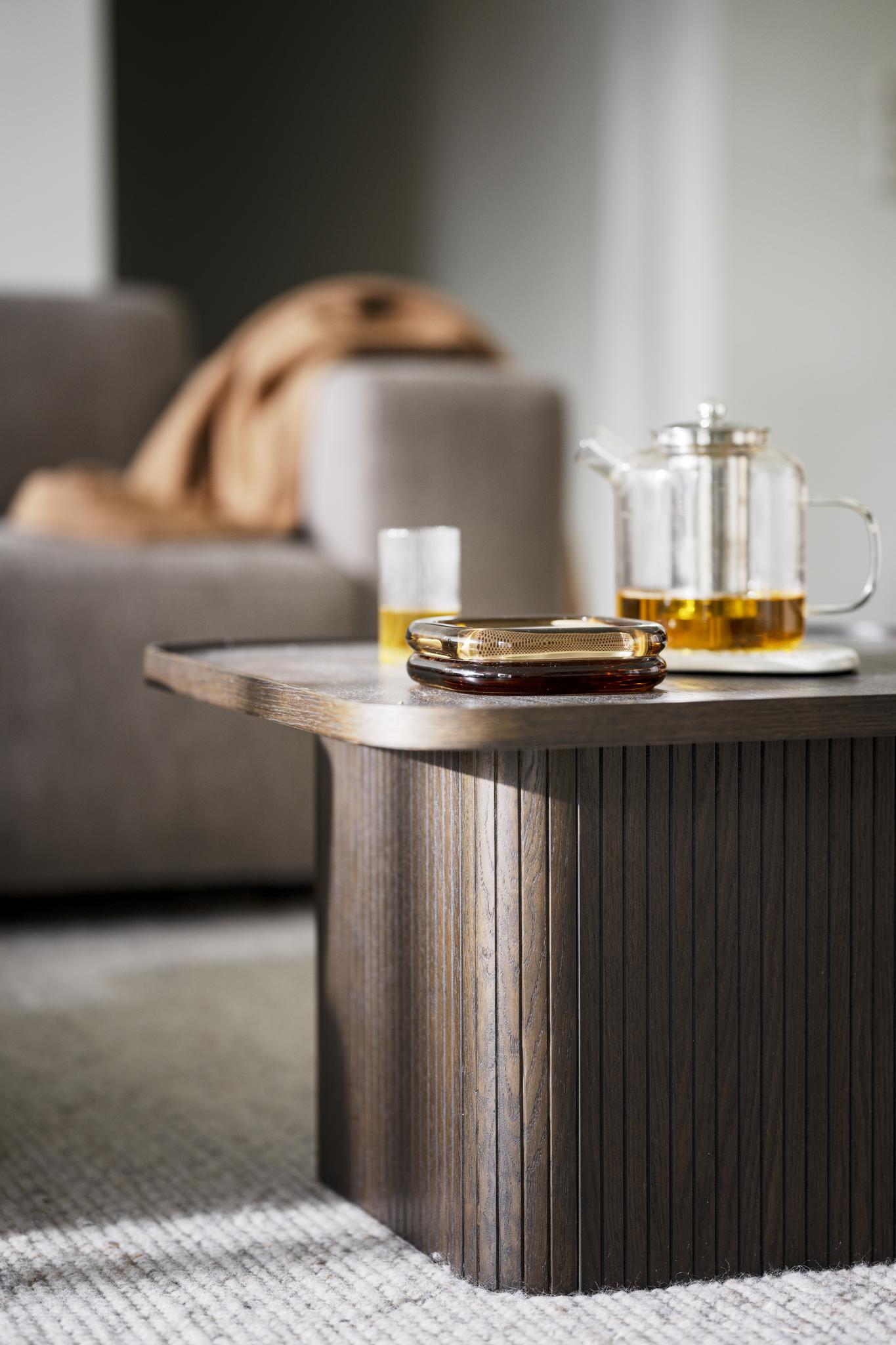 • Mörkt soffbord i trä med räfflad design, stylat med ljus, böcker och dekoration i ljust vardagsrum