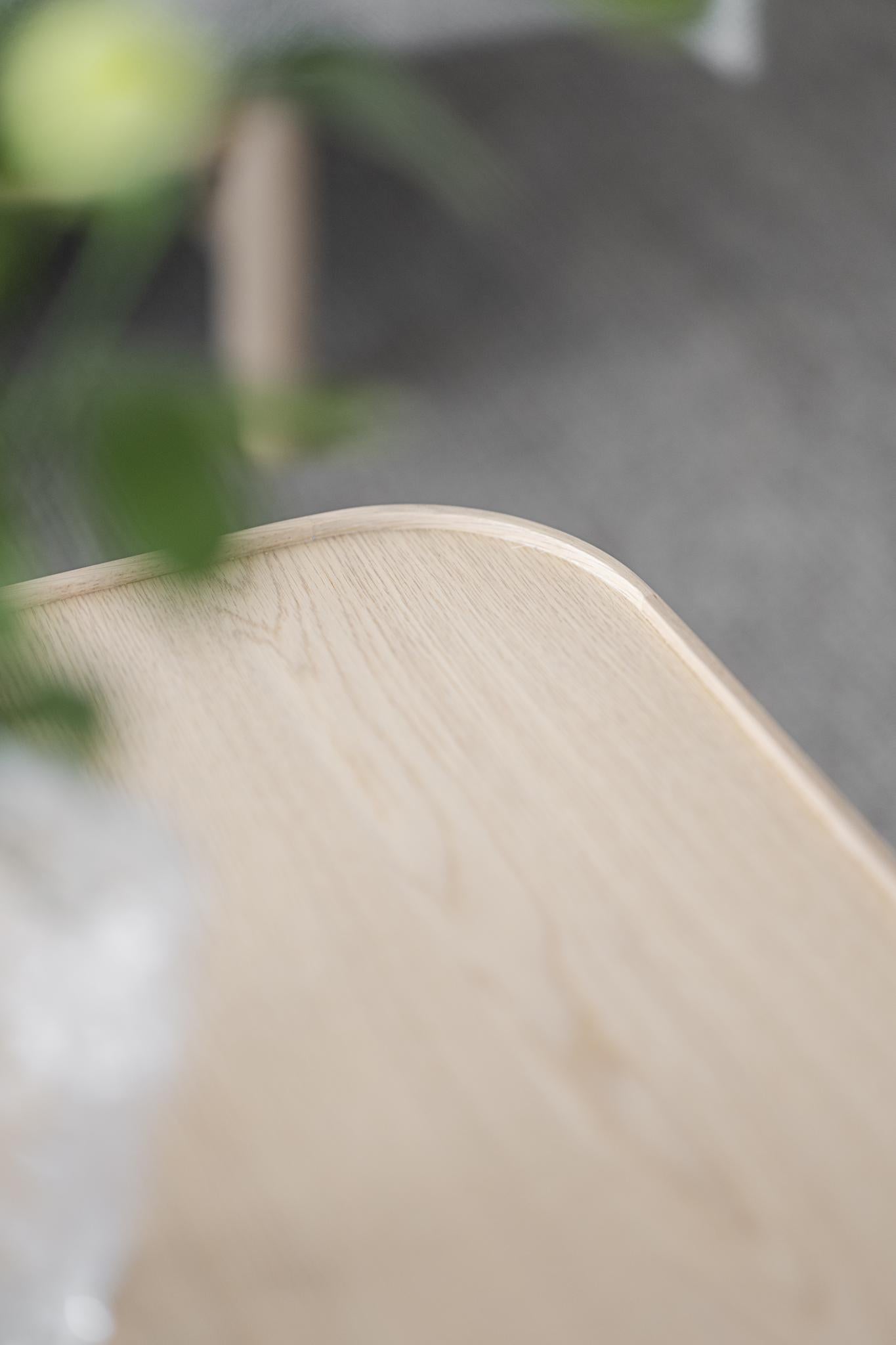 • Ljust träbord med naturlig trästruktur och rundad kant i närbild