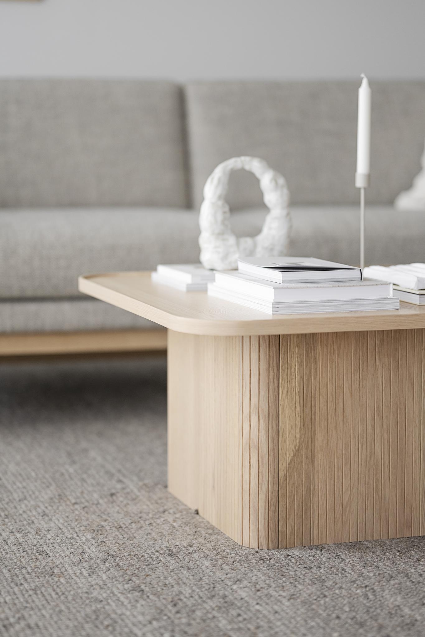 • Ljust soffbord i trä med rundade hörn framför grå soffa i minimalistisk skandinavisk vardagsrumsinredning