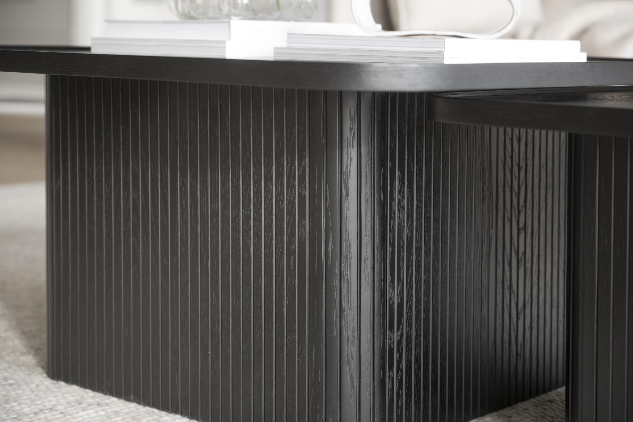 • Svarta soffbord med räfflad design och ljusgrå soffa i modern skandinavisk vardagsrumsinredning