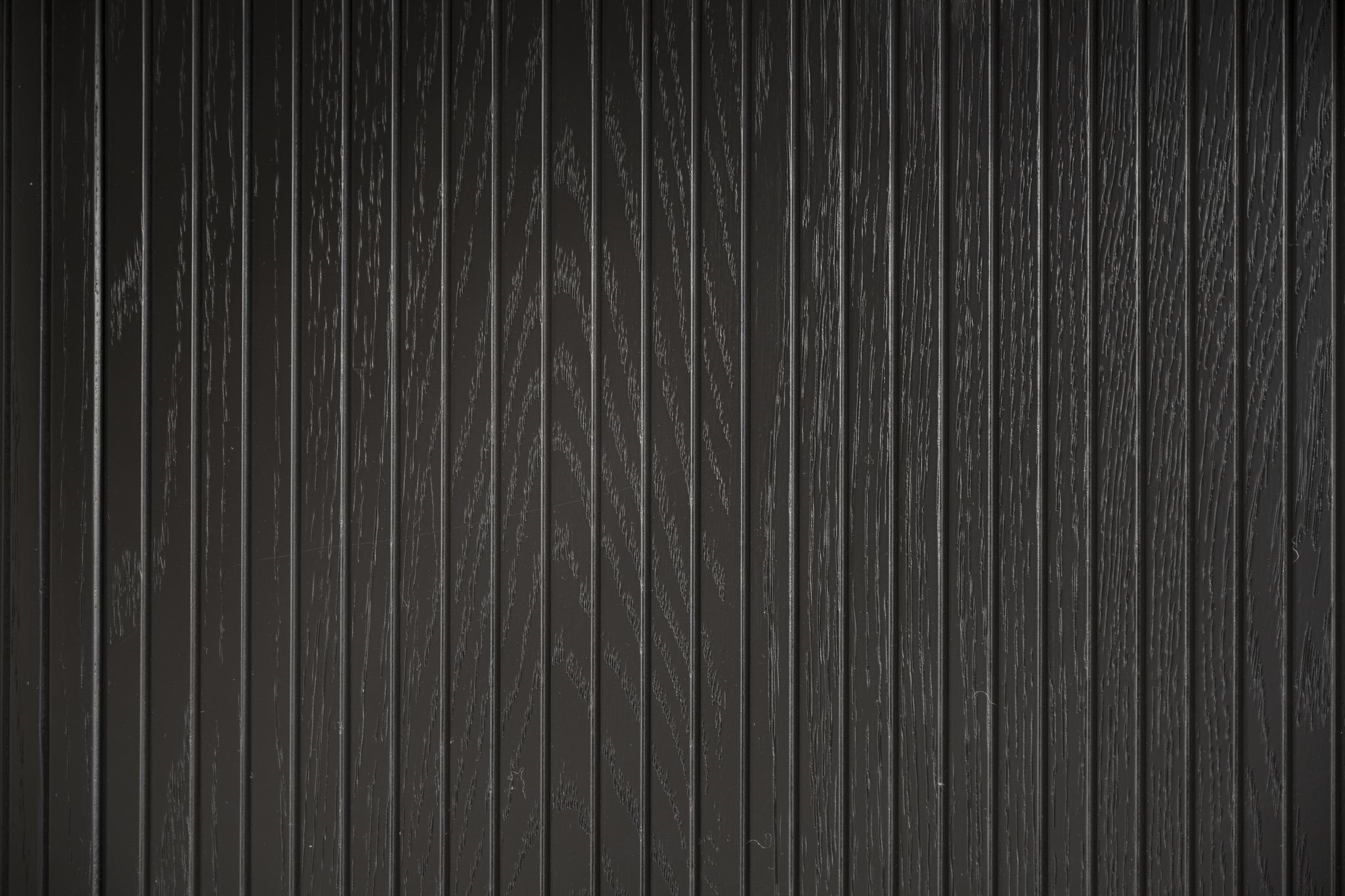 • Svart träpanel med vertikal ribbad struktur och synlig träådringsmönster