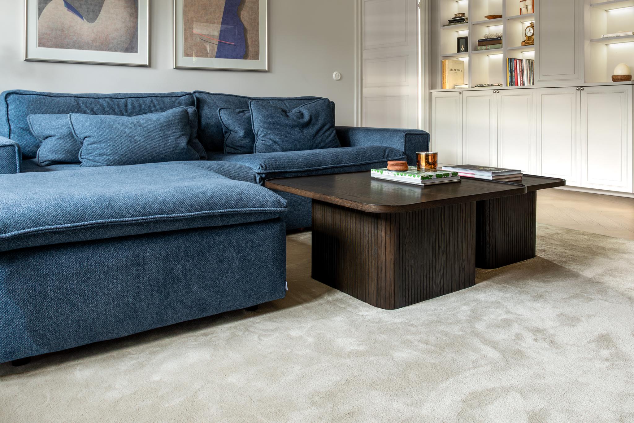 • Blå sammetsoffa med mörkt soffbord i modernt vardagsrum med beige matta och vit bokhylla