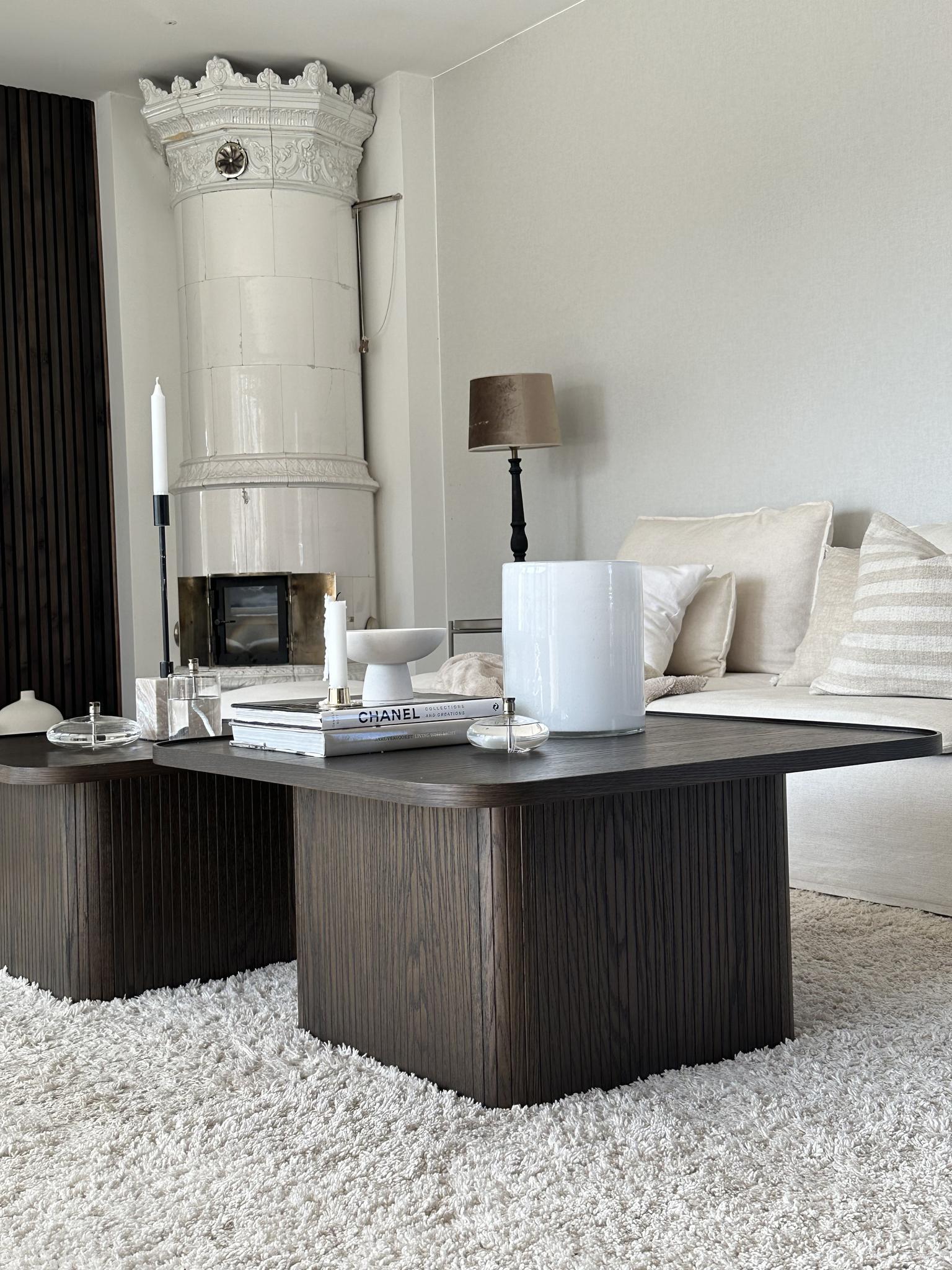 • Mörkbrunt soffbord med räfflad design i vardagsrum med vit kakelugn och beige soffa